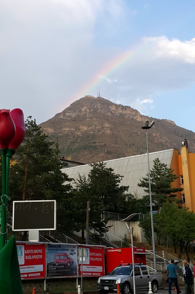 Şiddetli rüzgarın ardından sağanak olarak başlayan yağmur yağışı, akşam saatlerinde etkili olarak gerçekleşirken, gün batımına yakın bir zaman diliminde yağışın ardından şehrin simgelerinden olan Kuşakkaya Zirvesinde gökkuşağı belirdi.