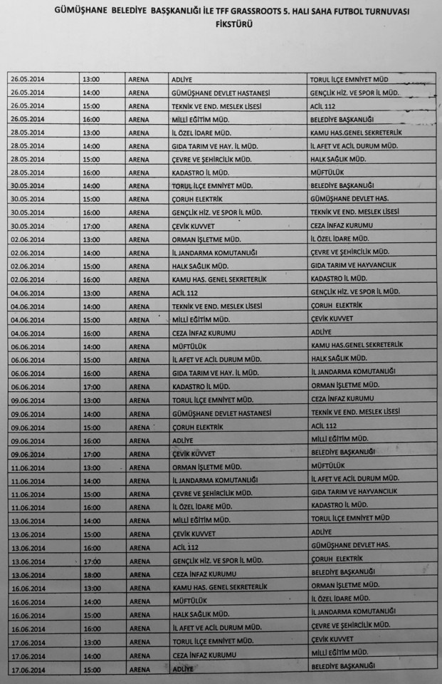 Dün başlayan ve 21 takımın katıldığı turnuvada Torul İlçe Emniyet Amirliği Gümüşhane Adliyesini 1-0, Gümüşhane Devlet Hastanesi Gençlik Hizmetleri ve Spor İl Müdürlüğünü 3-2, Acil 112 Teknik ve Endüstri Meslek Lisesini 8-1 mağlup ederken, Milli Eğitim Müdürlüğü ile Gümüşhane Belediye Başkanlığı 4-4 berabere kaldı.