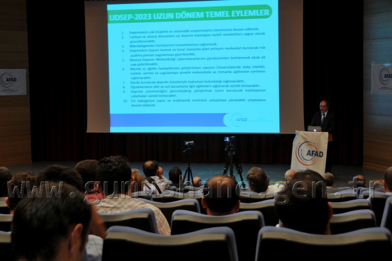 Başbakanlık Afet ve Acil Durum Yönetimi Başkanlığı (AFAD) Deprem Dairesi Başkanı Dr. Murat Nurlu ise 2012 ve 2023 yılları arasını kapsayan Ulusal Deprem Stratejisi ve Eylem Planı hakkında katılımcıları bilgilendirdi. Nurlu, sunumunun başında Türkiye’nin deprem geçmişinden örnekler vererek, 1900 yılından günümüze kadar 1000’den fazla can kaybına yol açan 14 depremin, şiddeti 6’dan büyük 14 depremin meydana geldiğini ve bu depremler 86 bin 893 kişinin öldüğünü, 526 bin 812 konutun da ağır hasar gördüğünü ve yıkıldığını hatırlattı. Nurlu ayrıca, aynı zamanda diliminde meydana gelen doğal afetlerin yüzde 61’lik bir oranla depremlerin birinci sırada yer aldığını da sözlerine ekledi.