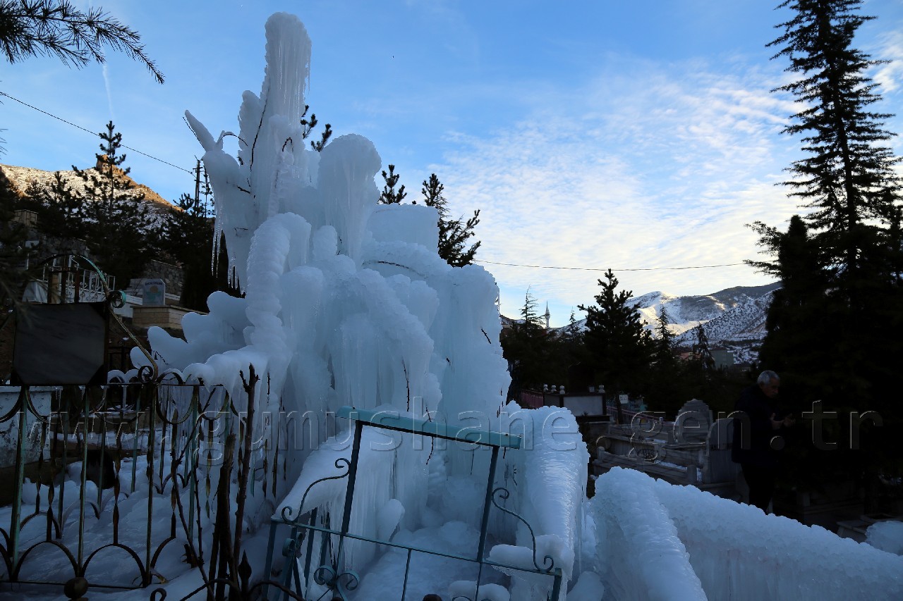 Olay, geçtiğimiz günlerde bir vatandaşın mezarlığının bitişiğindeki musluğun aşırı soğuk hava nedeniyle patlaması sonucu meydana geldi. Geceleri hava sıcaklığının sıfırın altında 15 derecelere kadar düşmesi nedeniyle mezarlık ve etrafındaki ağaçların üzerine kadar sıçrayan su taneleri donunca ortaya buzdan devasa yapıtlar çıktı.