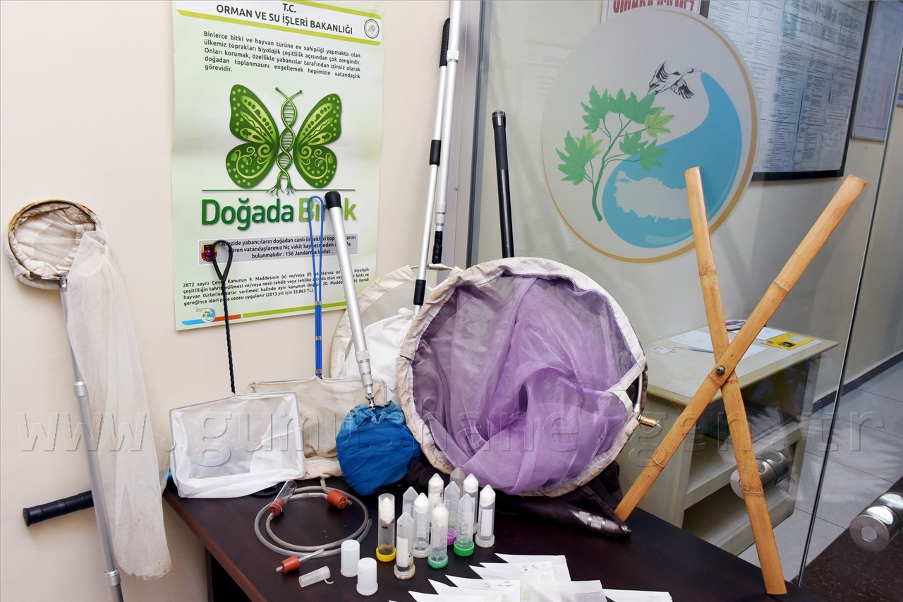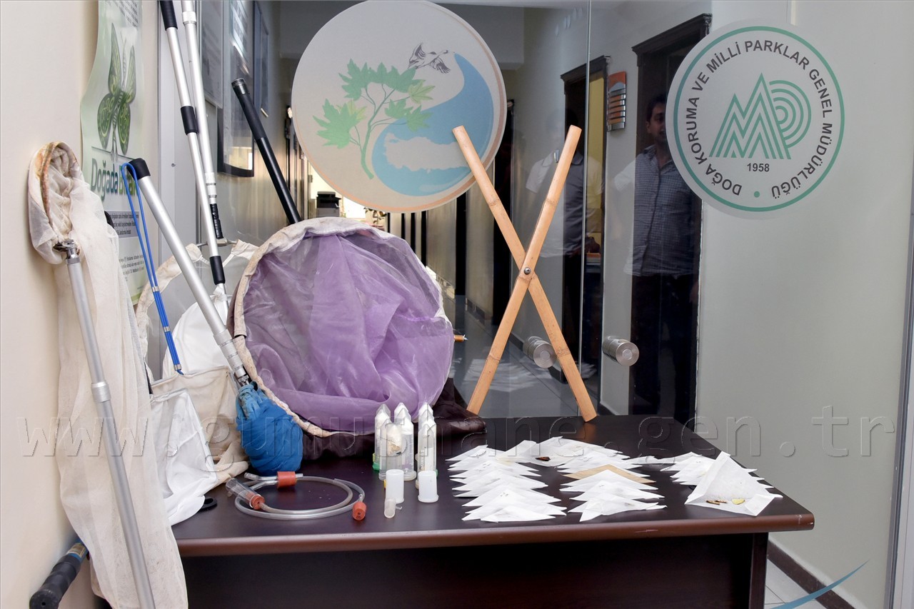 Yapılan arama sonucunda şahısların araç ve çantalarında 9 adet kelebek yakalama aparatı, 35 adet poşet içerisine konulmuş 100 adet kelebek, 6 kutu içerisinde 105 adet böcek ele geçirildi.