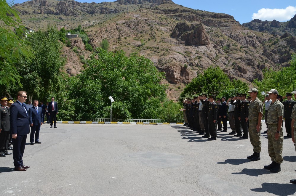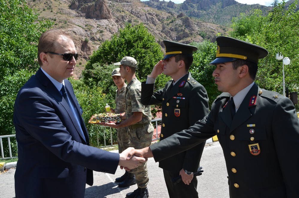 Devlet Hastanesi’nin ardından İl Jandarma Alay Komutanlığı’nı ziyaret eden ve burada tören mangası tarafından karşılanan Vali Yavuz, askeri personel ile tek tek bayramlaştıktan sonra İl Jandarma Alay Komutan Vekili Albay Hasan Metin’in makamına geçerek, bir süre sohbet etti.