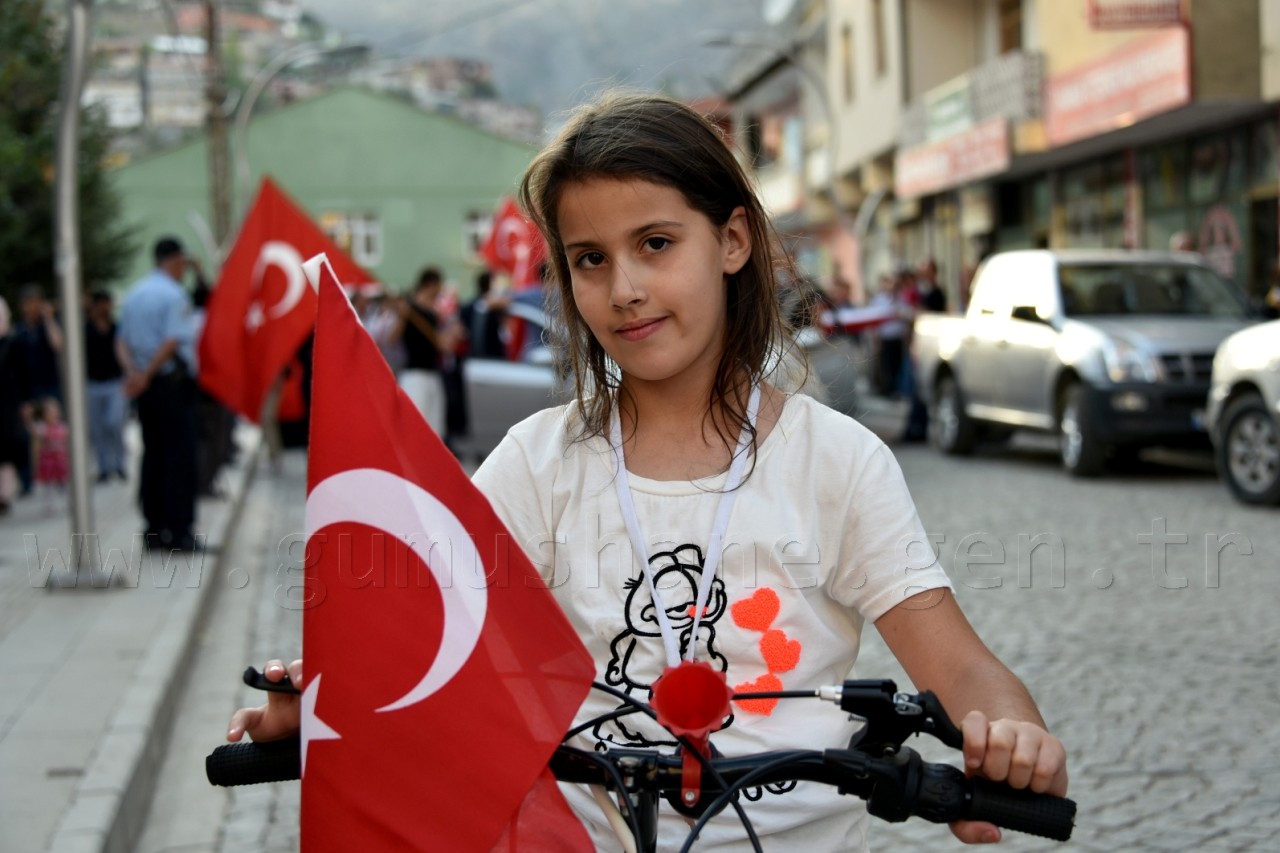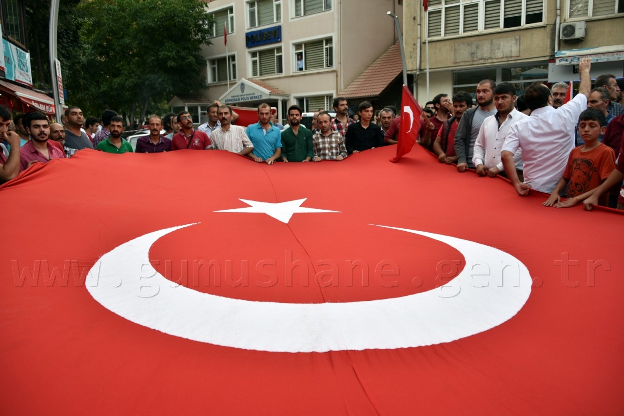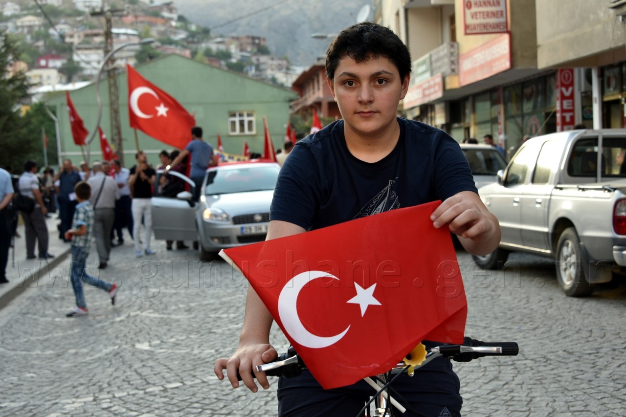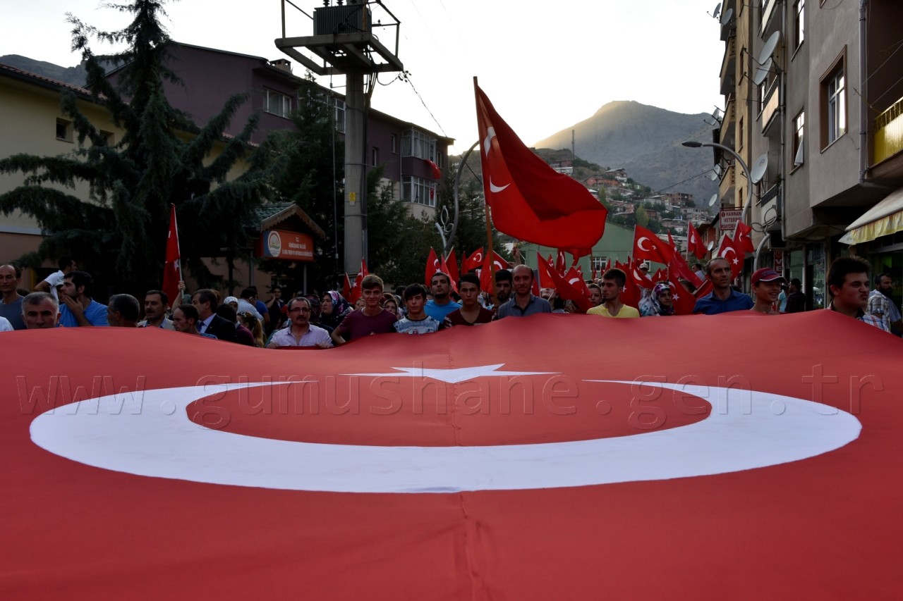 Gıda, Tarım ve Hayvancılık İl Müdürlüğü önünde Türk bayraklarıyla süslenen bisiklet, motosiklet ve otomobillerin öncülüğünde başlayan yürüyüşte, ellerinde “Terörü lanetliyoruz” pankartlarıyla yürüyen binlerce kişi “Şehitler ölmez, vatan bölünmez”, “Gümüşhane uyuma şehidine sahip çık”, “Vur vur inlesin Apo piçi dinlesin”, Bayrağa uzanan eller kırılsın”, “Her Türk asker doğar”, “Dişe diş, kana kan intikam”,” Vatan sana canım feda” sloganları atarak, tekbirler getirerek Fatih Parkı önüne kadar yürüdü.