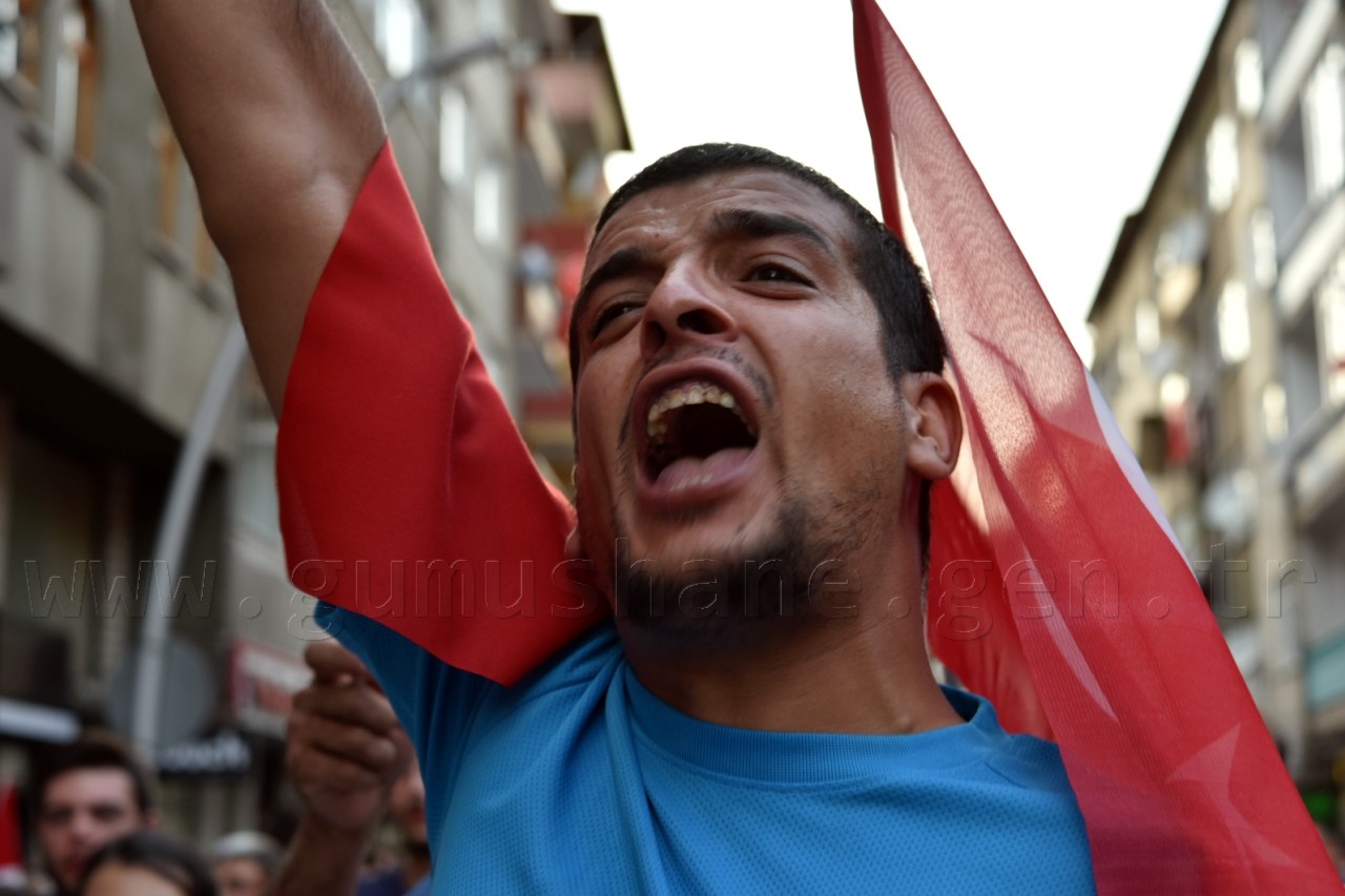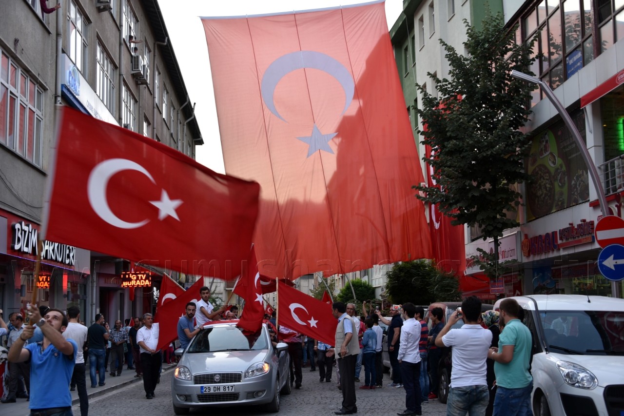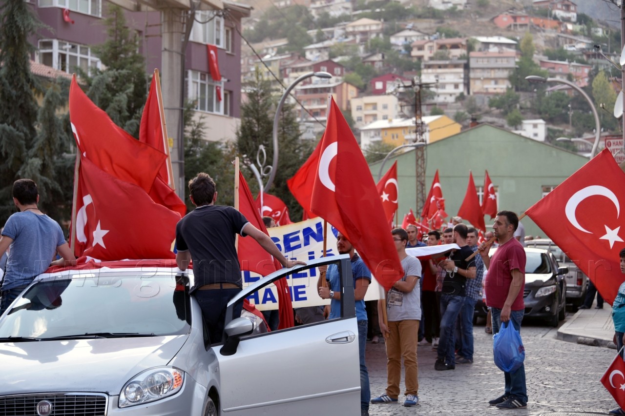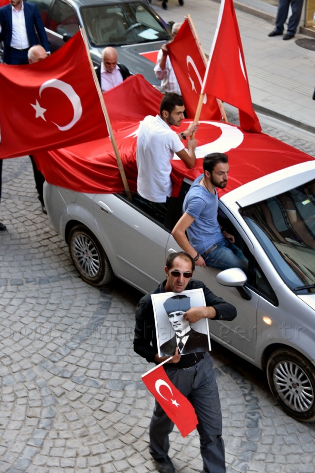 Gıda, Tarım ve Hayvancılık İl Müdürlüğü önünde Türk bayraklarıyla süslenen bisiklet, motosiklet ve otomobillerin öncülüğünde başlayan yürüyüşte, ellerinde “Terörü lanetliyoruz” pankartlarıyla yürüyen binlerce kişi “Şehitler ölmez, vatan bölünmez”, “Gümüşhane uyuma şehidine sahip çık”, “Vur vur inlesin Apo piçi dinlesin”, Bayrağa uzanan eller kırılsın”, “Her Türk asker doğar”, “Dişe diş, kana kan intikam”,” Vatan sana canım feda” sloganları atarak, tekbirler getirerek Fatih Parkı önüne kadar yürüdü.