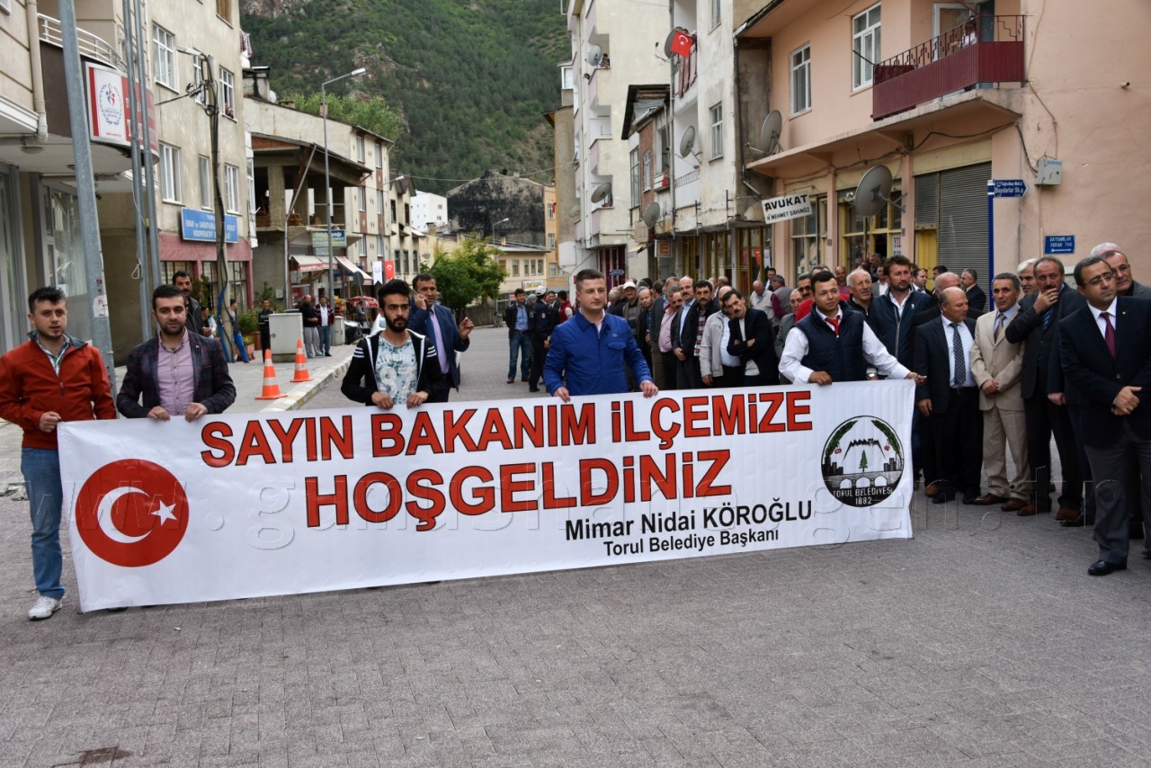 Trabzon üzerinden karayoluyla şehre gelen ve ilk olarak Torul ilçesini ziyaret eden Bakan Eroğlu, burada Vali Yücel Yavuz, Torul Kaymakamı Hakan Kafkas, Gümüşhane Belediye Başkanı Ercan Çimen, Torul Belediye Başkanı Nidai Köroğlu, AK Parti İl Başkanı Celalettin Köse, AK Parti Gümüşhane Milletvekili adayları Hacı Osman Akgül, Cihan Pektaş ve çok sayıda vatandaş tarafından karşılandı.