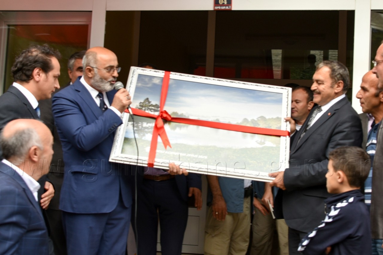 Konuşmanın ardından Torul Belediye Başkanı Nidai Köroğlu, Bakan Eroğlu'na ilçeye bağlı Altınpınar köyünde bulunan Limni Gölünün fotoğrafının yer aldığı tabloyu hediye etti.