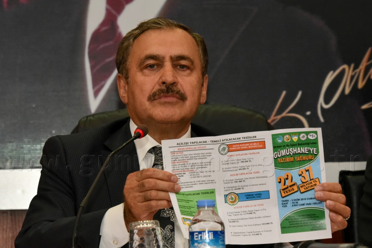Toplantıda Gümüşhane’ye yapılan ve devam eden yatırımlarla ilgili geniş bilgiler aktaran Bakan Eroğlu, ayrıca Bakanlığına ait 86 milyon liralık 15 adet yatırımla ilgili müjde verdi. Şehir merkezine içme suyu sağlayacak olan Bahçecik Barajının ihalesinin de önümüzdeki Mayıs ayında yapılacağını söyledi.
