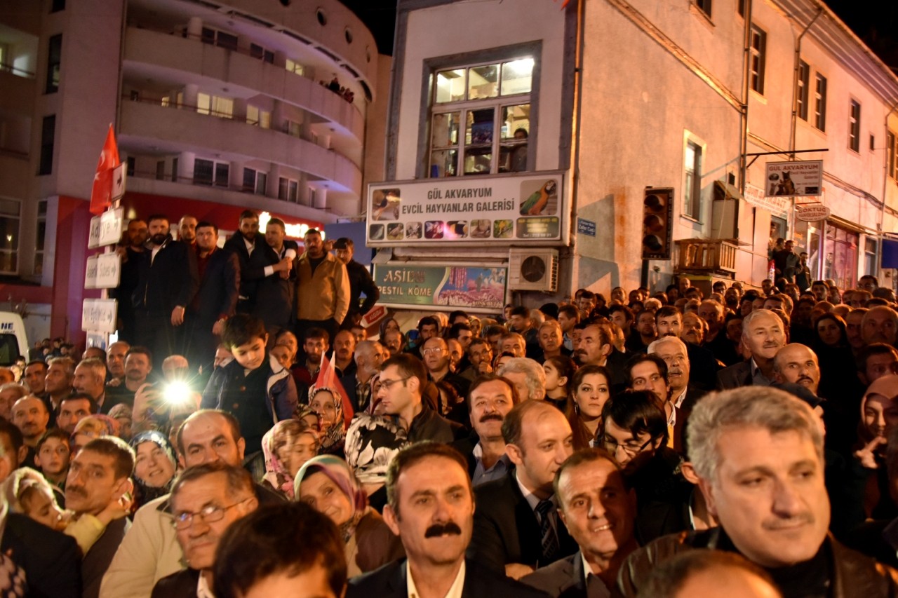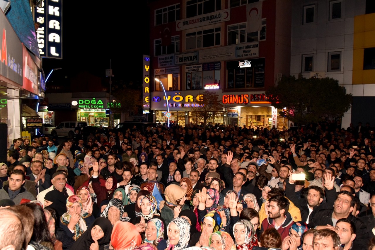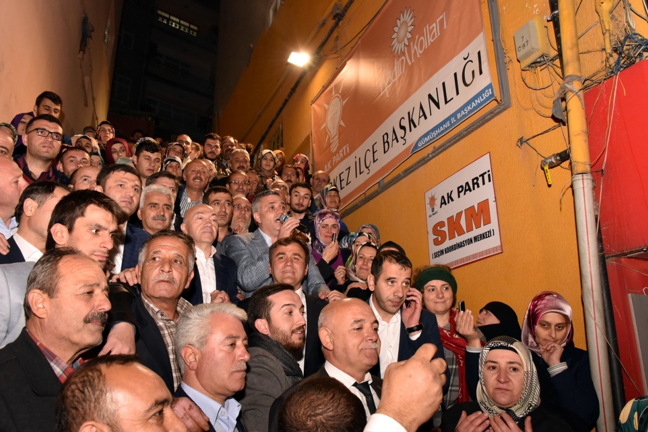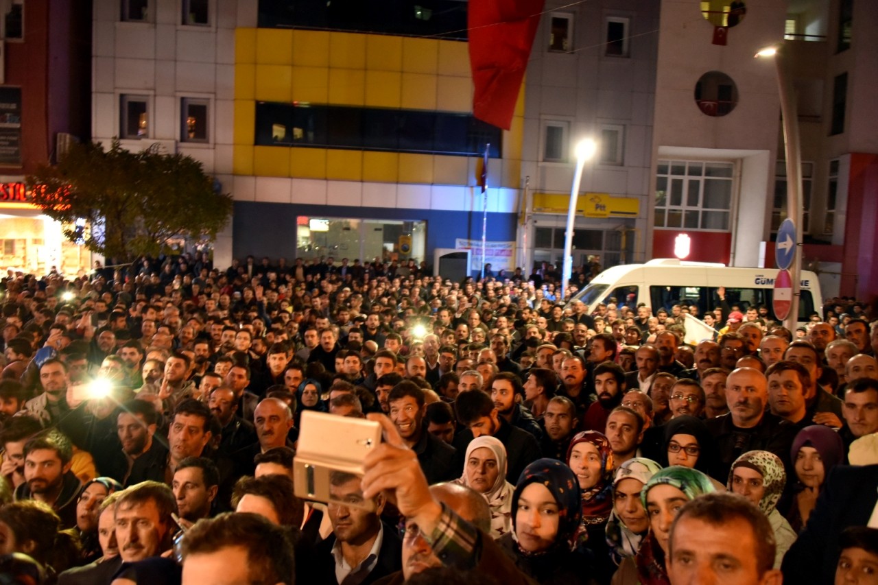 Gümüşhane Milletvekilleri Hacı Osman Akgül ve Cihan Pektaş parti binası önünde toplanan yüzlerce partiliye coşkulu birer konuşma yaparken, vatandaşların talebiyle Pektaş “Dua” şiiriyle konuşmasını sonlandırdı.