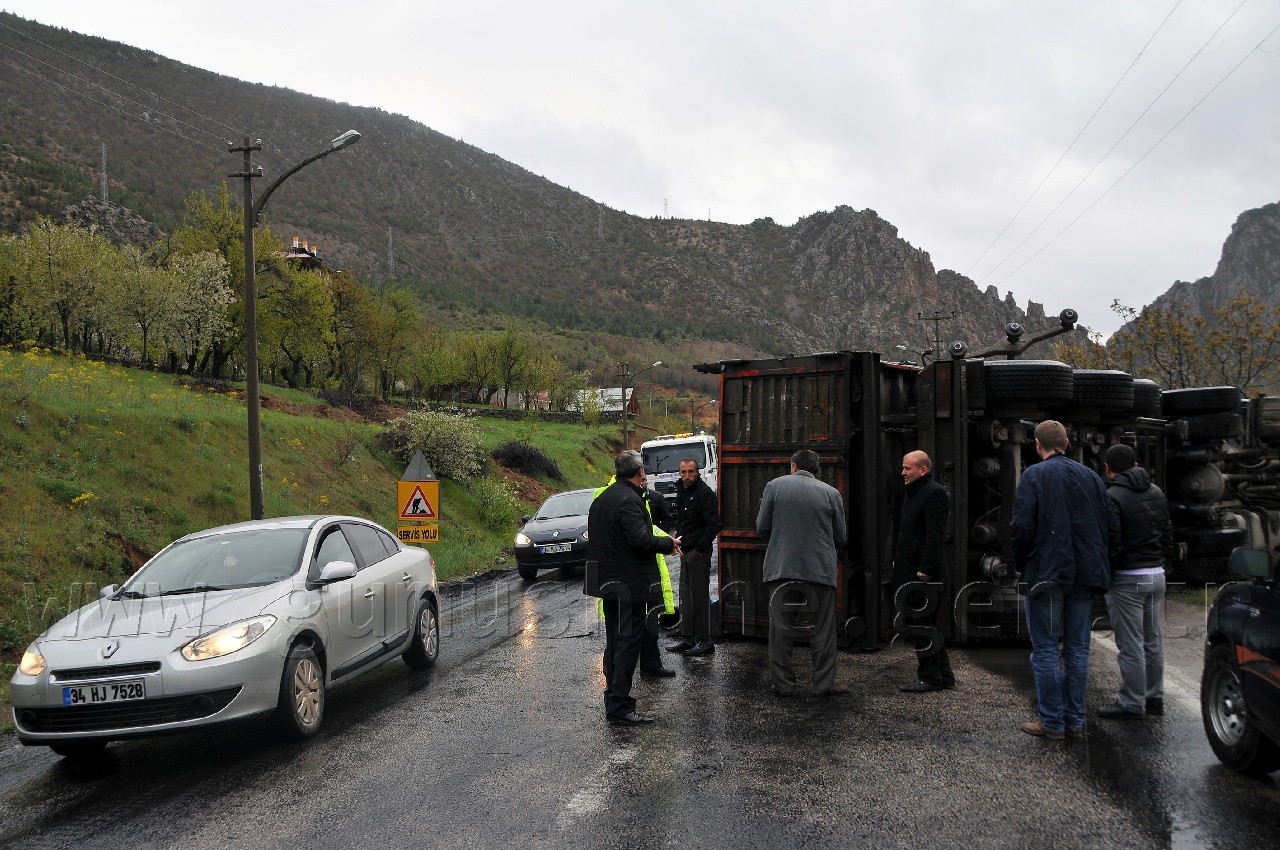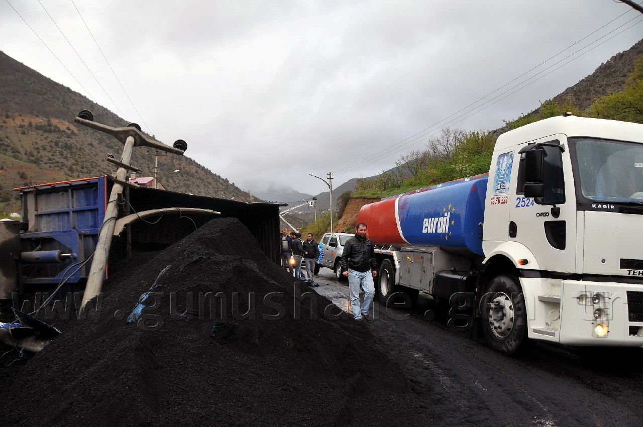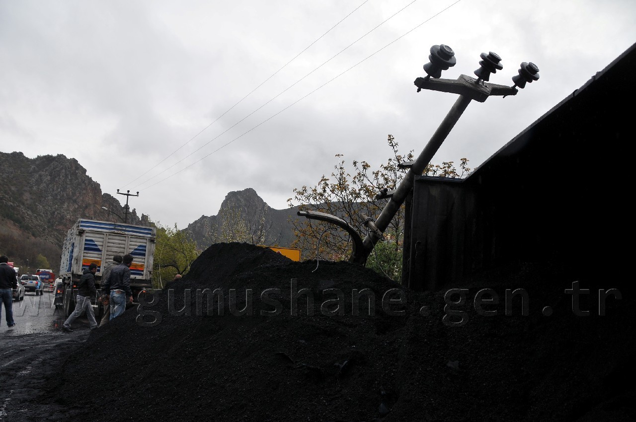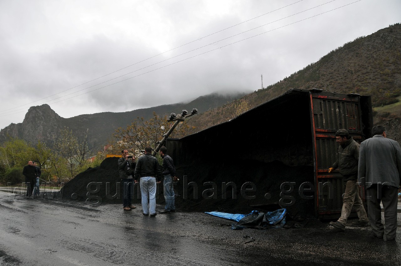 Trabzon-Gümüşhane karayolunun Torul ilçesi mevkiinde meydana gelen trafik kazasında kömür yüklü tır devrildi. arayolu kaza nedeniyle bir süre ulaşıma  kapandı.
