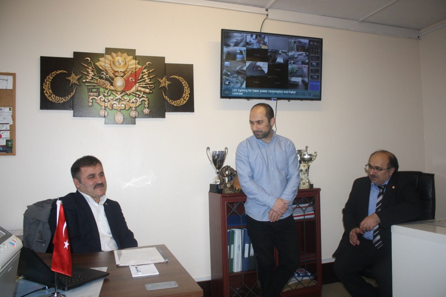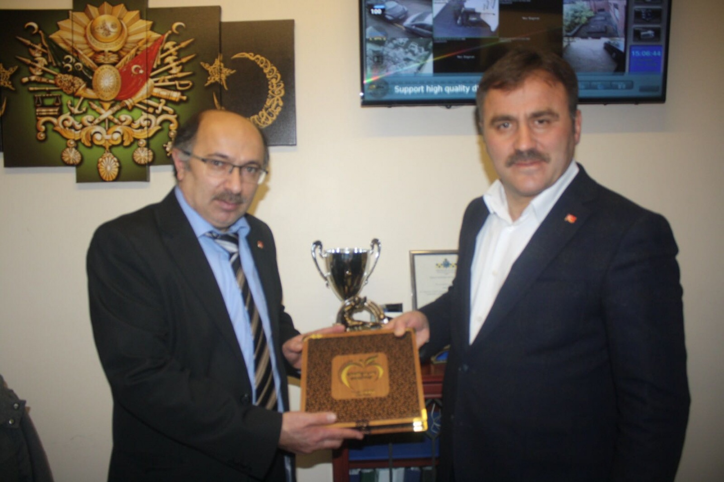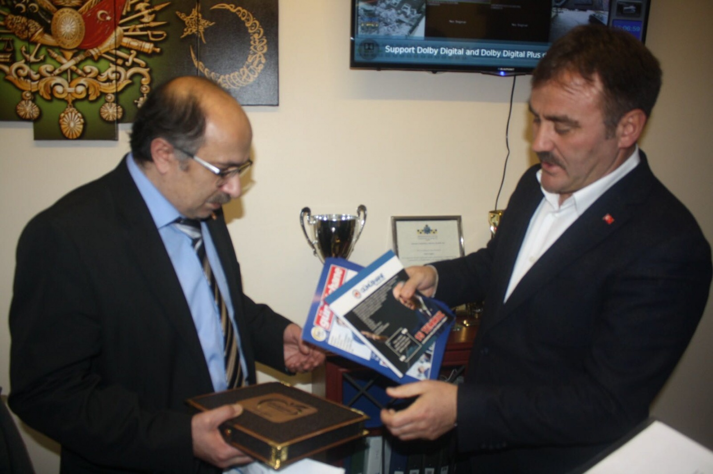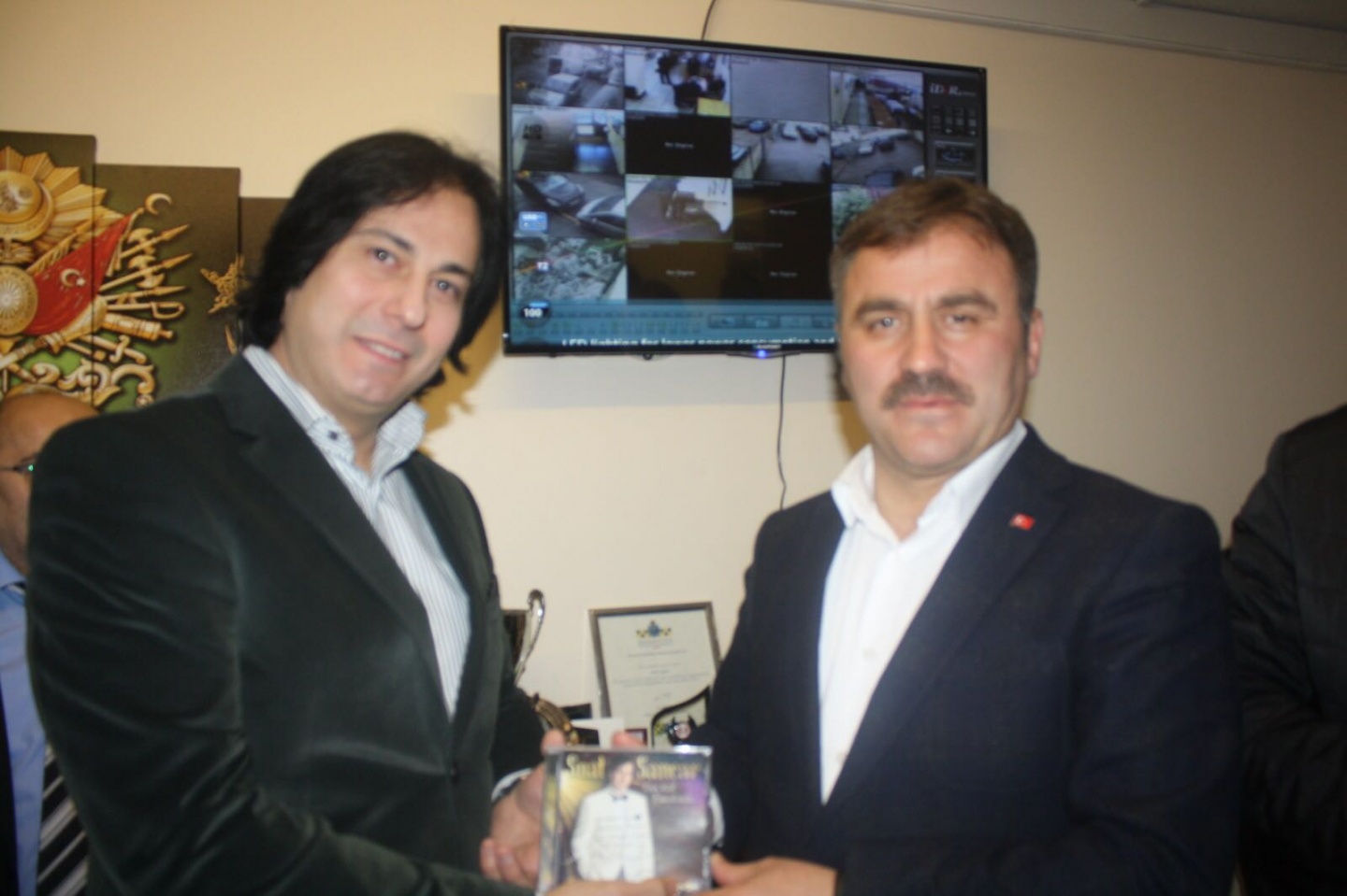 Sanatçı Suat Sancar belediye başkanı Ercan Çimen'e ve dernek başkanı Atilla Üstün'e imzalı cd takdim etti.