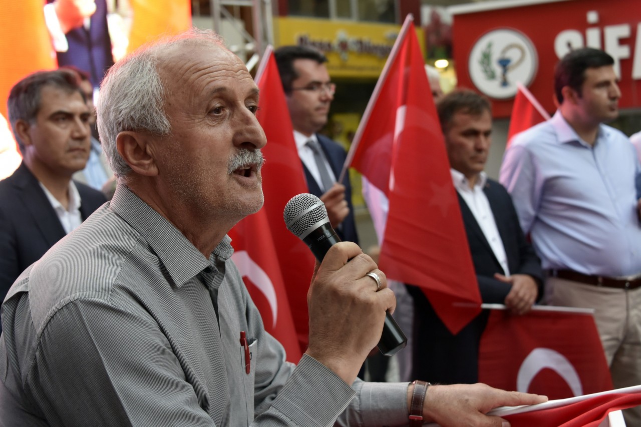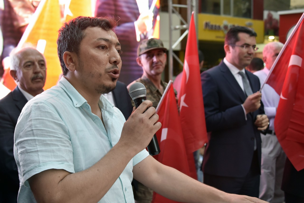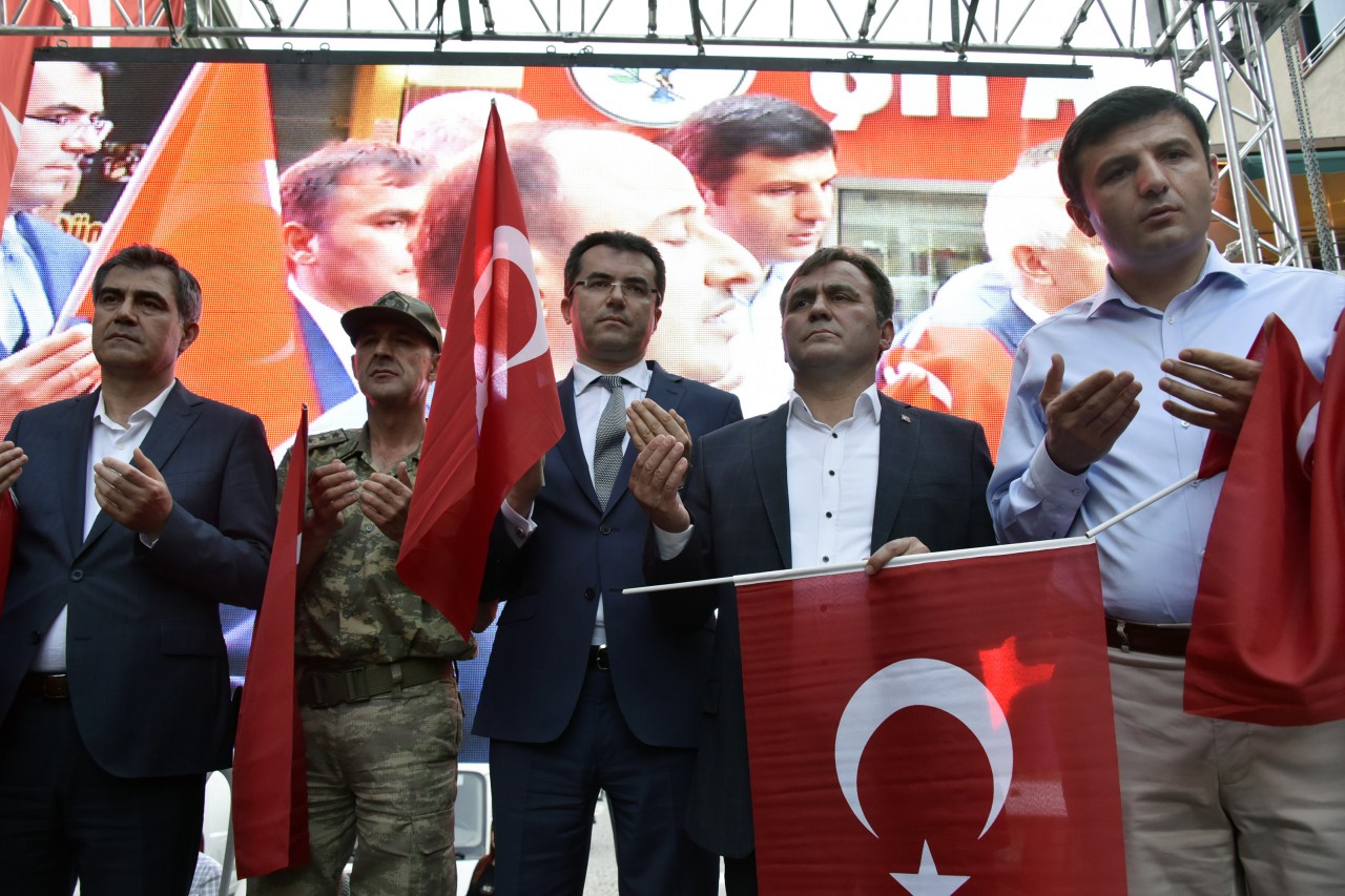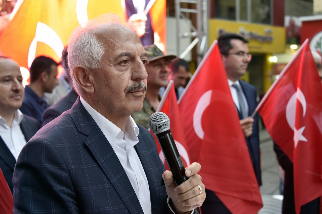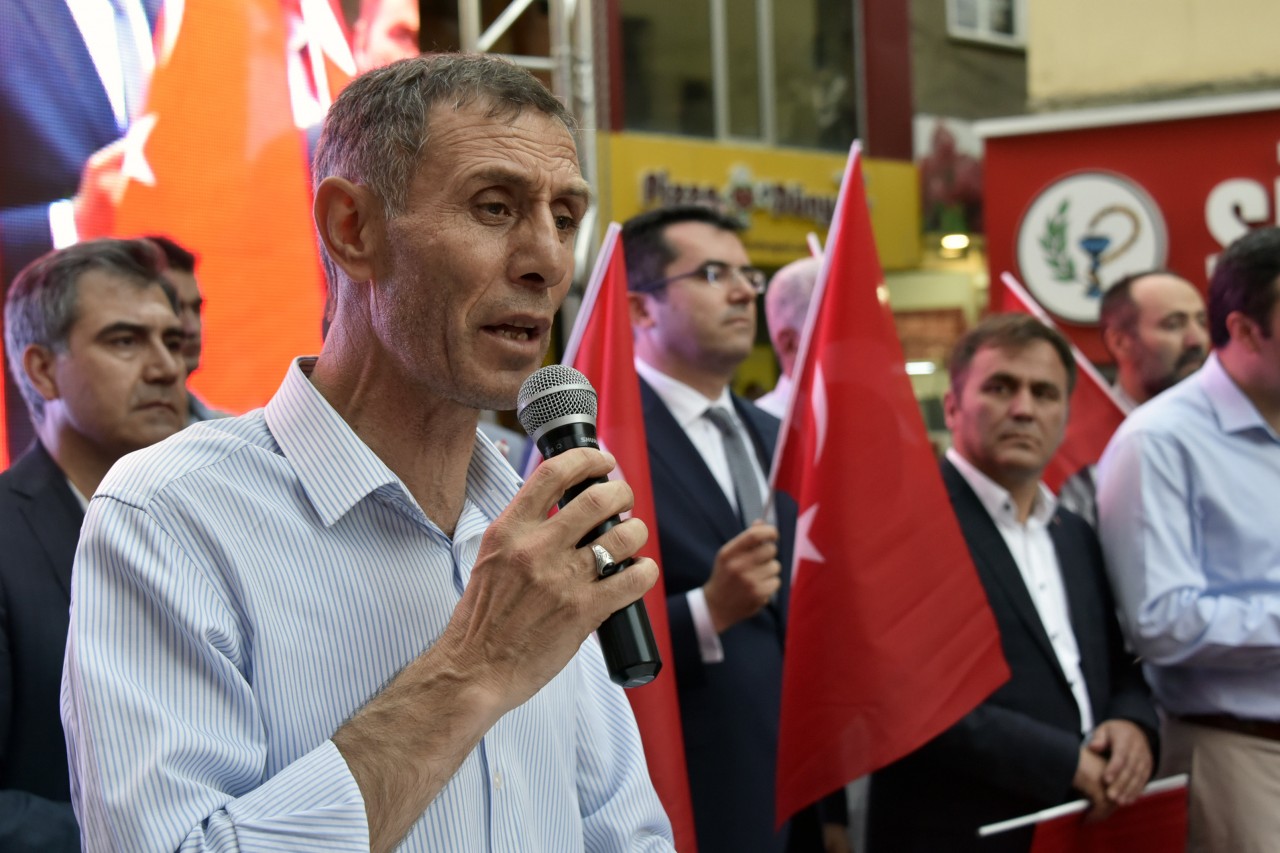 Daha sonra şehrin kanaat önderleri ellerinde Türk bayraklarıyla platform üzerine çıkarak alanı dolduran vatandaşları coşkulu bir şekilde selamladı. Program İstiklal Marşı’nın okunması, Kur’an-ı Kerim tilaveti ve İl Müftüsü Ercan Aksu’nun yaptığı dua ile başladı.