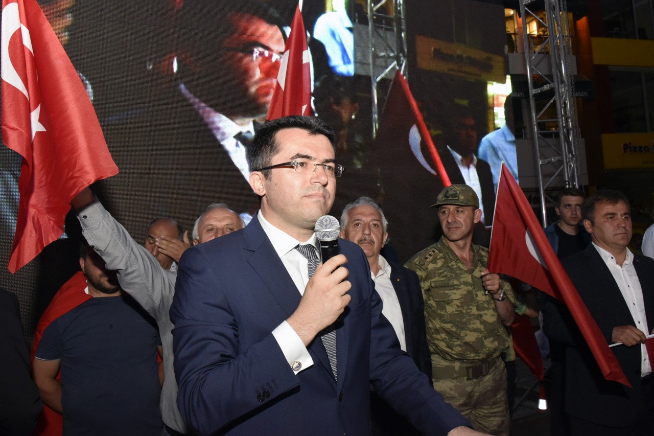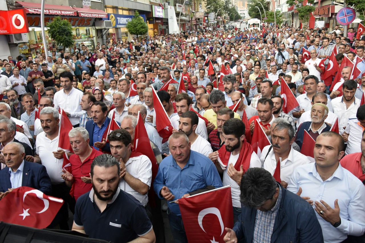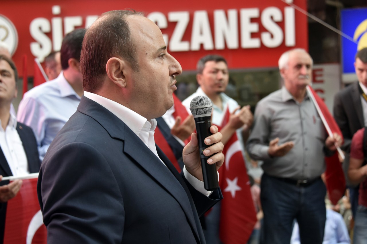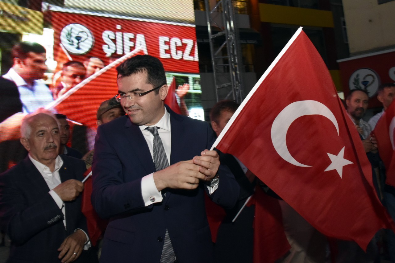 Daha sonra şehrin kanaat önderleri ellerinde Türk bayraklarıyla platform üzerine çıkarak alanı dolduran vatandaşları coşkulu bir şekilde selamladı. Program İstiklal Marşı’nın okunması, Kur’an-ı Kerim tilaveti ve İl Müftüsü Ercan Aksu’nun yaptığı dua ile başladı.