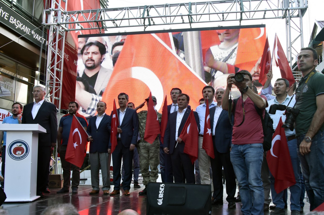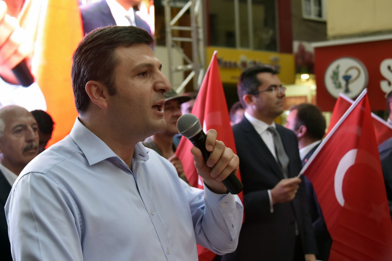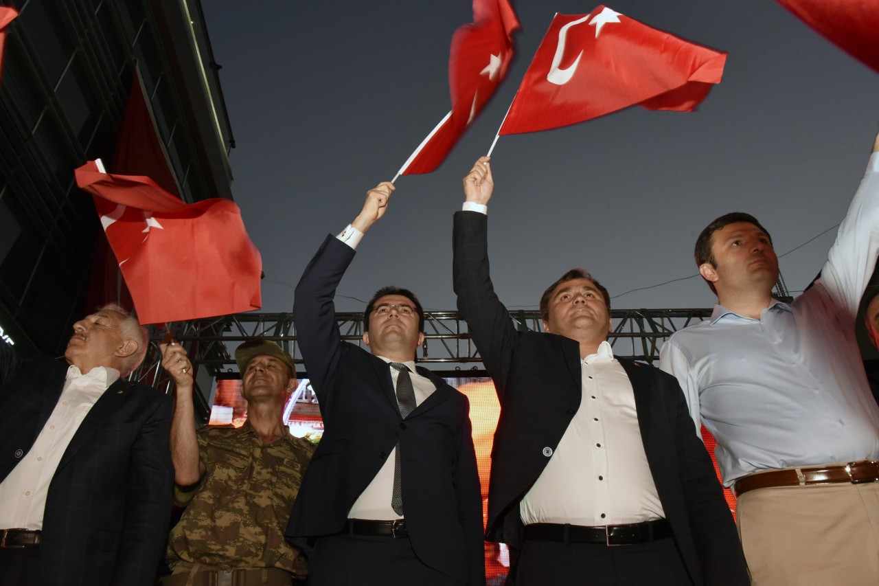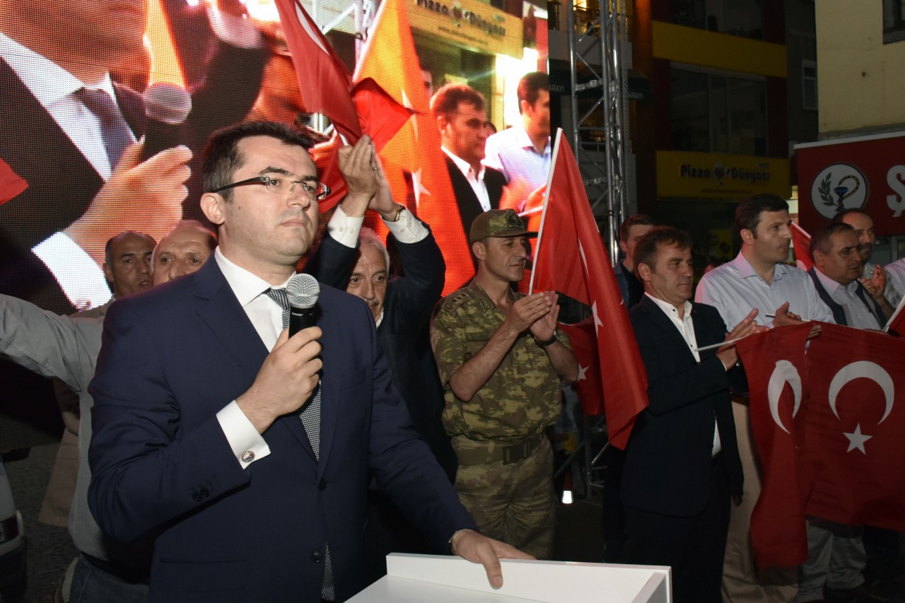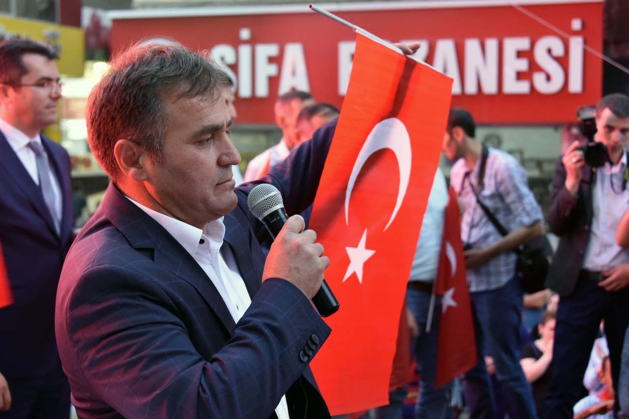Daha sonra şehrin kanaat önderleri ellerinde Türk bayraklarıyla platform üzerine çıkarak alanı dolduran vatandaşları coşkulu bir şekilde selamladı. Program İstiklal Marşı’nın okunması, Kur’an-ı Kerim tilaveti ve İl Müftüsü Ercan Aksu’nun yaptığı dua ile başladı.