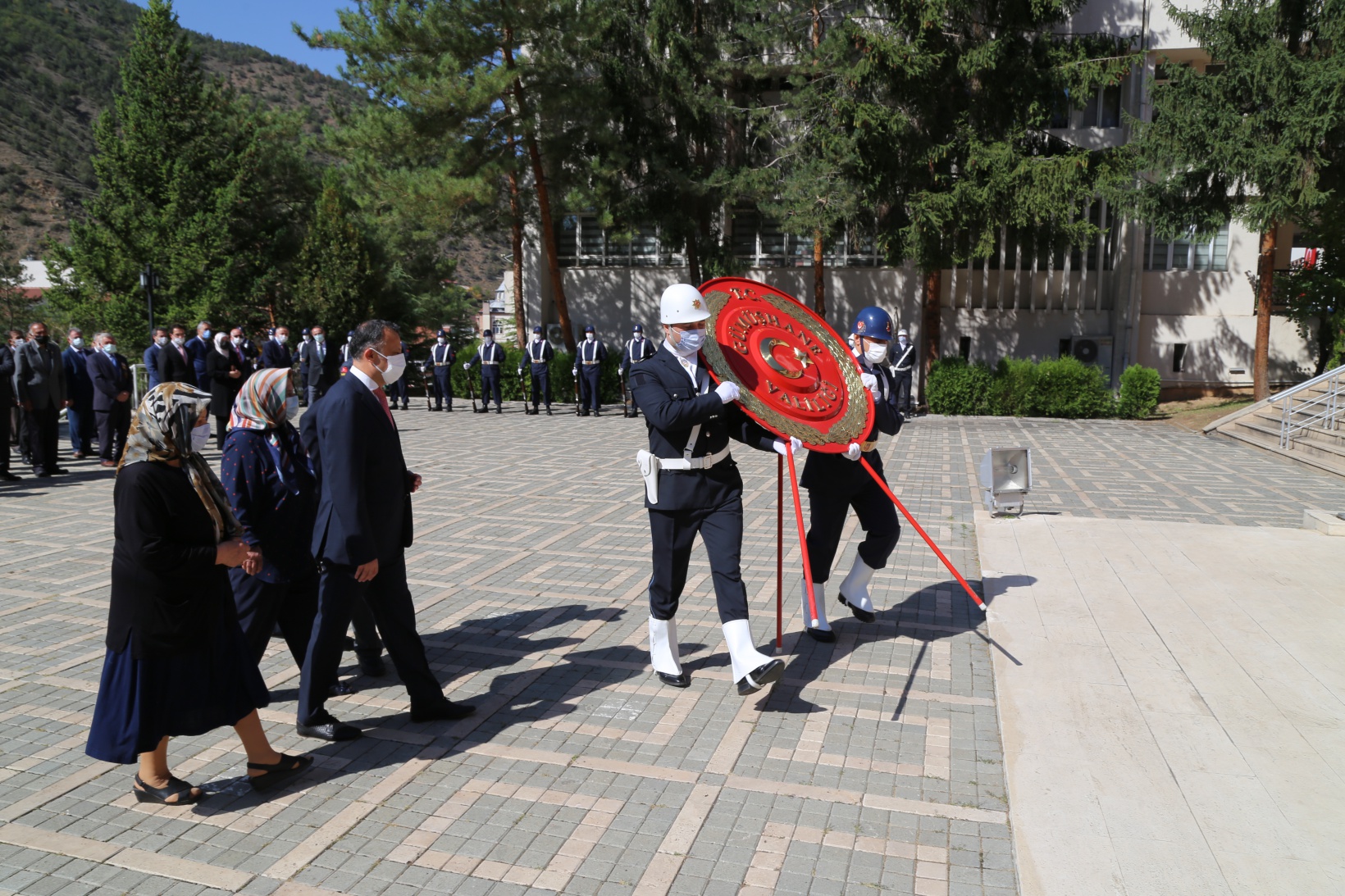 Hükümet Konağı önündeki Atatürk Anıtı önünde düzenlenen ilk törende Vali Kamuran Taşbilek, Belediye Başkanı Ercan Çimen ve Türkiye Muharip Gaziler Derneği İl Temsilcisi Celil Tanguroğlu gazi ve şehit aileleriyle anıta çelenk sundu.