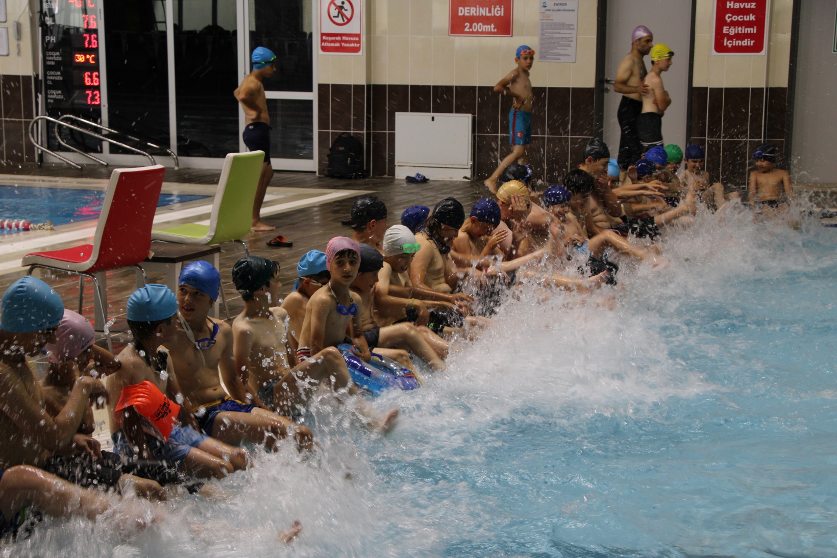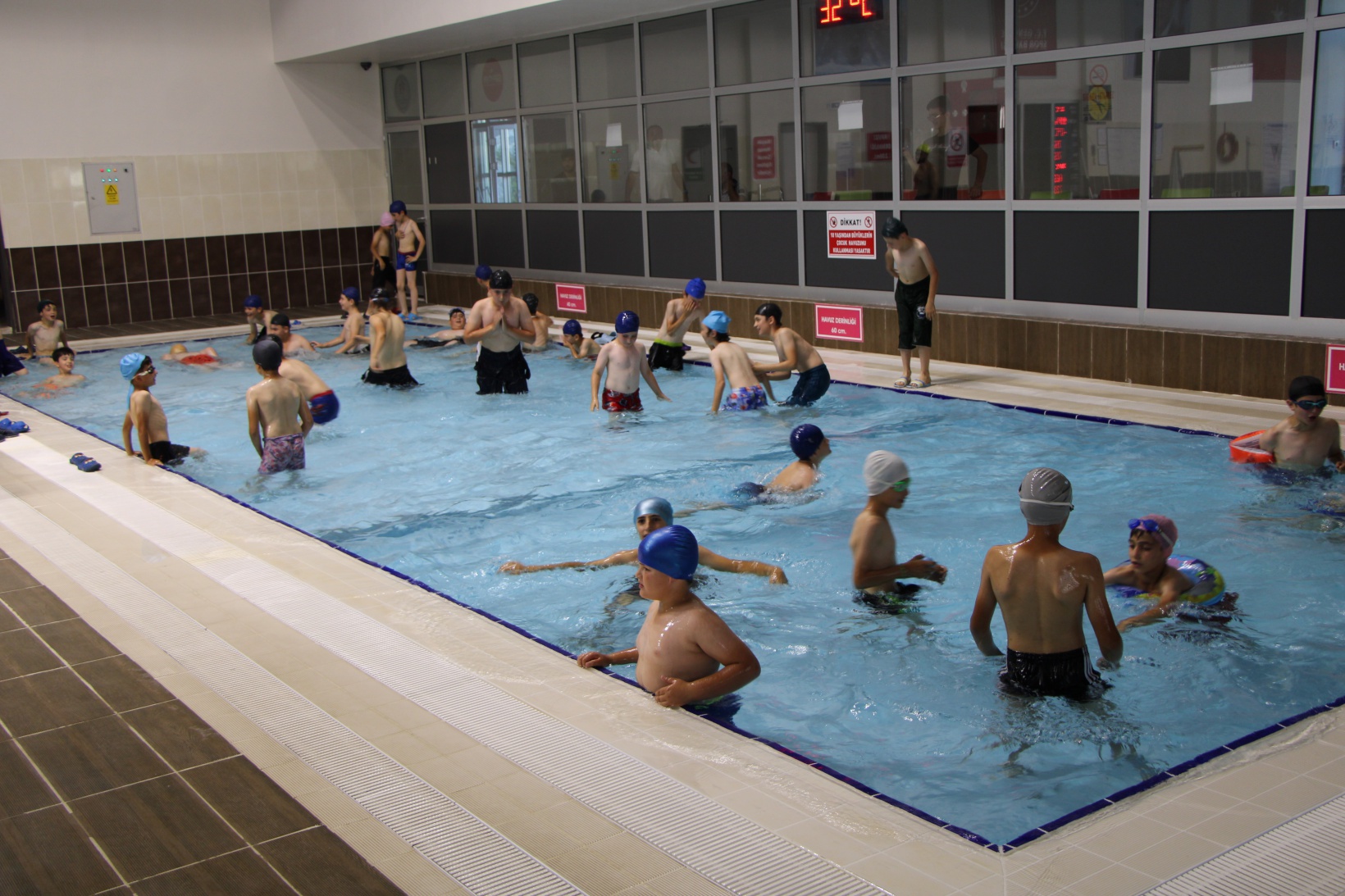 Yarı Olimpik Yüzme Havuzunda cankurtaranların gözetimi altında eğlenceli vakit geçiren çocuklar ayrıca Gençlik ve Spor İl Müdürlüğü’nde görevli yüzme antrenörlerinden eğitim alarak yüzmeyi öğreniyor. Hayatlarında ilk defa havuzla tanışan çocukların mutlulukları ise yüzlerinden okunuyor.