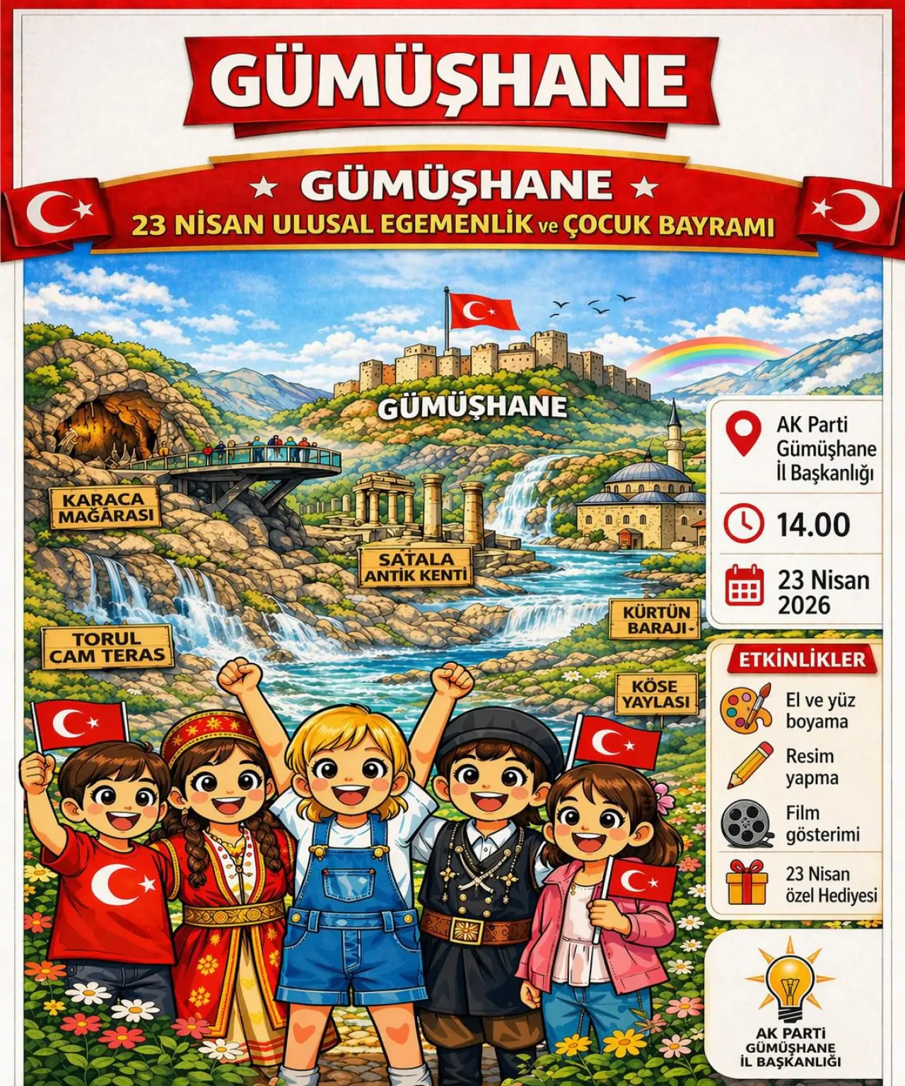 Hazırlanan programın adresi AK Parti Gümüşhane İl Başkanlığı binası olarak belirlendi. 23 Nisan 2026 tarihinde saat 14.00’te başlayacak olan şenlik için parti binasında özel alanlar oluşturuldu. Etkinlik kapsamında minikler için el ve yüz boyama stantları kuruldu, çocukların hayal dünyalarını kağıda dökecekleri resim atölyeleri hazırlandı. Ayrıca çocukların keyifli vakit geçirmesi amacıyla özel bir film gösterimi seansı da programa eklendi.