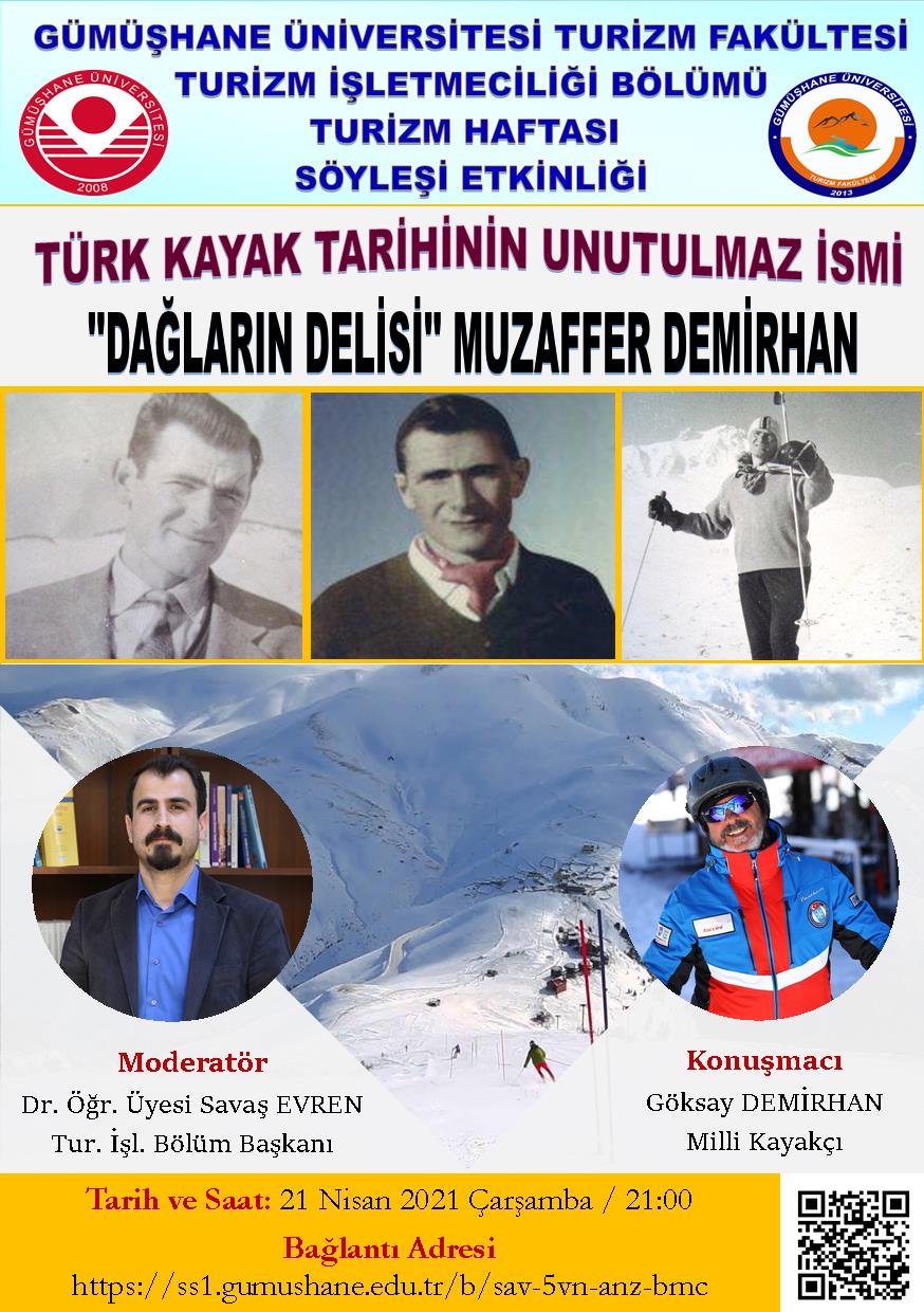 Turizm Fakültesi 45’inci Turizm Haftası Etkinlikleri, Gümüşhaneli efsane kayakçı merhum Muzaffer Demirhan’ın anılacağı “Dağların Delisi Muzaffer Demirhan” adlı programla son bulacak. Programda, Muzaffer Demirhan’ı milli kayakçı Göksay Demirhan anlatacak. Bu etkinliğin tarihi ise 21 Nisan 2021 Çarşamba saat 21:00’dır. Etkinliğe https://ss1.gumushane.edu.tr/b/sav-5vn-anz-bmc uzantısından ulaşmak mümkün olacak.