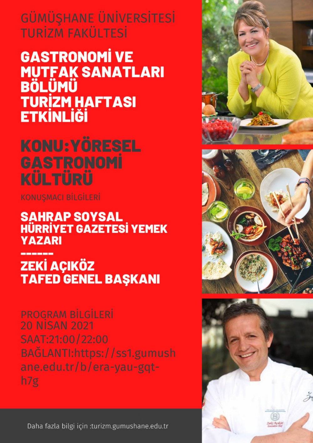 Programların ikincisinde, Gümüşhaneli hemşerimiz Hürriyet Gazetesi Yemek Yazarı Sahrap Soysal ve Türkiye Aşçılar Federasyonu (TAFED) başkanı Zeki Açıkgöz konuk olacak. “Yöresel Gastronomi Kültürü” başlıklı program 20 Nisan 2021 Salı günü saat 21:00’da düzenlenecek. Etkinlik https://ss1.gumushane.edu.tr/b/era-yau-gqt-h7g bağlantısı üzerinden takip edilebilecek.