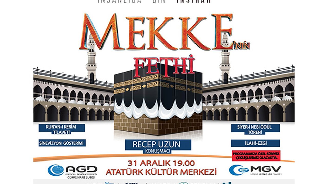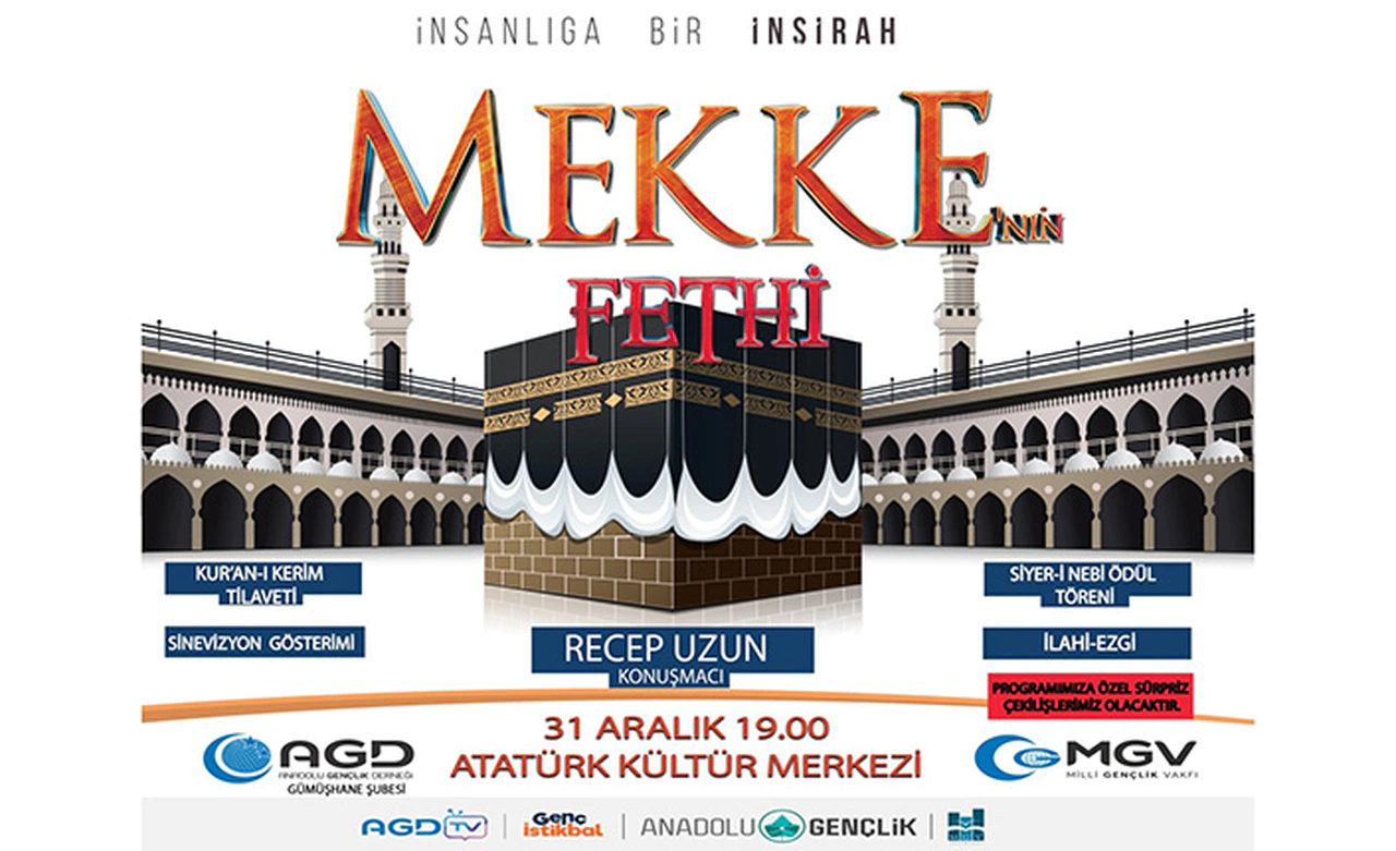 AGD Gümüşhane Şube Başkanı Naci Şenel, 31 Aralık gecesinde 81 ilde yaklaşık 600 noktada Mekke’nin Fethi Programı düzenleyeceklerini belirterek, “Bilindiği üzere yeryüzünün ilk binası Kâbe’nin bulunduğu şehir olan Mekke İslam Ordularınca 1 Ocak 630 tarihinde fethedilmiştir. Biz bu programları düzenlerken fethin hicri ya da miladi yıldönümünü ya da fethin kronolojisini konuşmadan ziyade fetih ruhunu kuşanmanın derdindeyiz. Ayrıca biz, İstanbul’un Fethini Diyarbakır’a, Diyarbakır’ın Fethini Kudüs’e, Kudüs’ün Fethini Mekke’ye ve Mekke’nin Fethi’ni de vahyin insanlığa olan çağrısına bağlamayan her anlayışın eksik olduğunu düşünüyoruz” dedi.