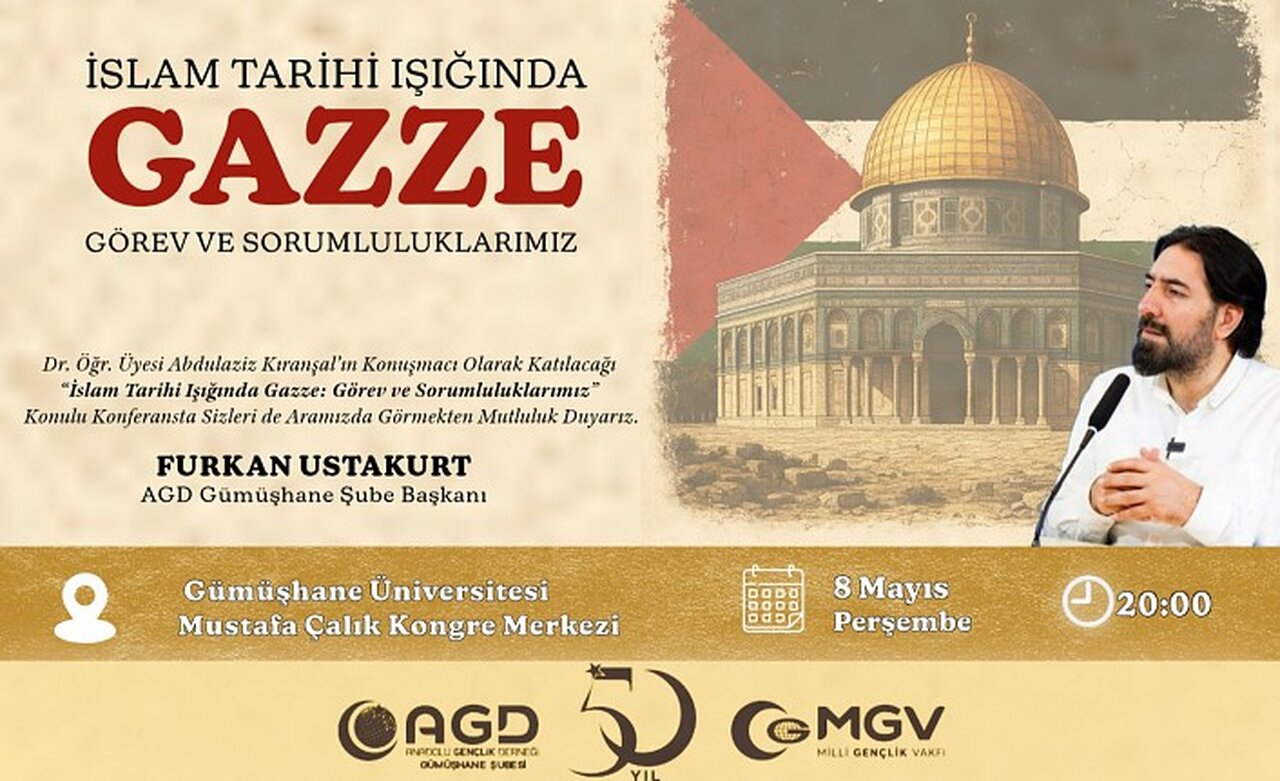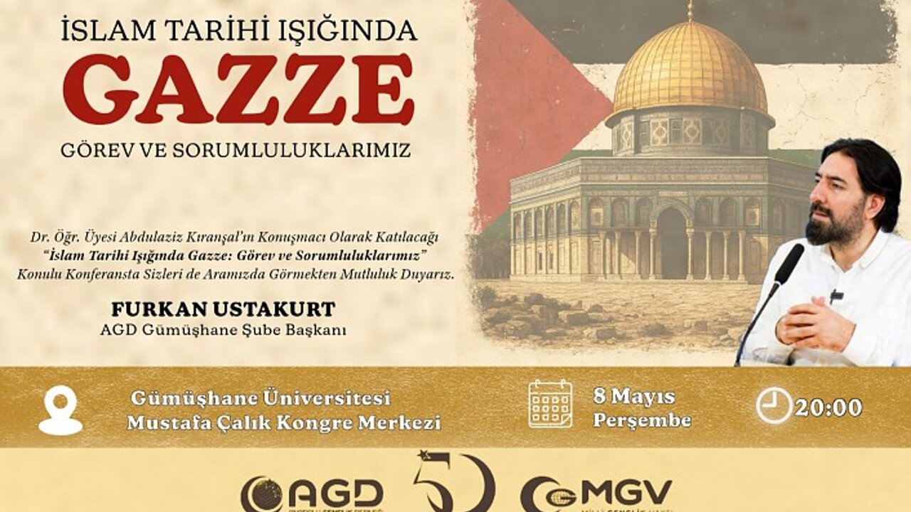 Programla ilgili AGD Gümüşhane Şubesi’nden yapılan açıklamada şu ifadeler kullanıldı: “Programda İslam tarihi ışığında Gazze hassasiyetimizi canlı tutmak ve üzerimize düşen sorumlulukları hatırlatmak gayesiyle bir araya geleceğiz. Gazze’deki mücadelenin ana gayesi olan Mescid-i Aksa’nın savunulmasının coğrafi değil imani bir mesele olduğunu unutmamalı ve bu hususta elimizden geleni yapmalıyız. Her eylemin bizi yeniden dirilteceği niyazıyla 8 Mayıs Perşembe Günü Saat 20:00’de Gümüşhane Üniversitesi Mustafa Çalık Kongre Merkezi’nde düzenlenecek "İslam Tarihi Işığında Gazze, Görev ve Sorumluluklarımız" programına tüm Gümüşhaneli hemşerilerimizi davet ediyoruz.”