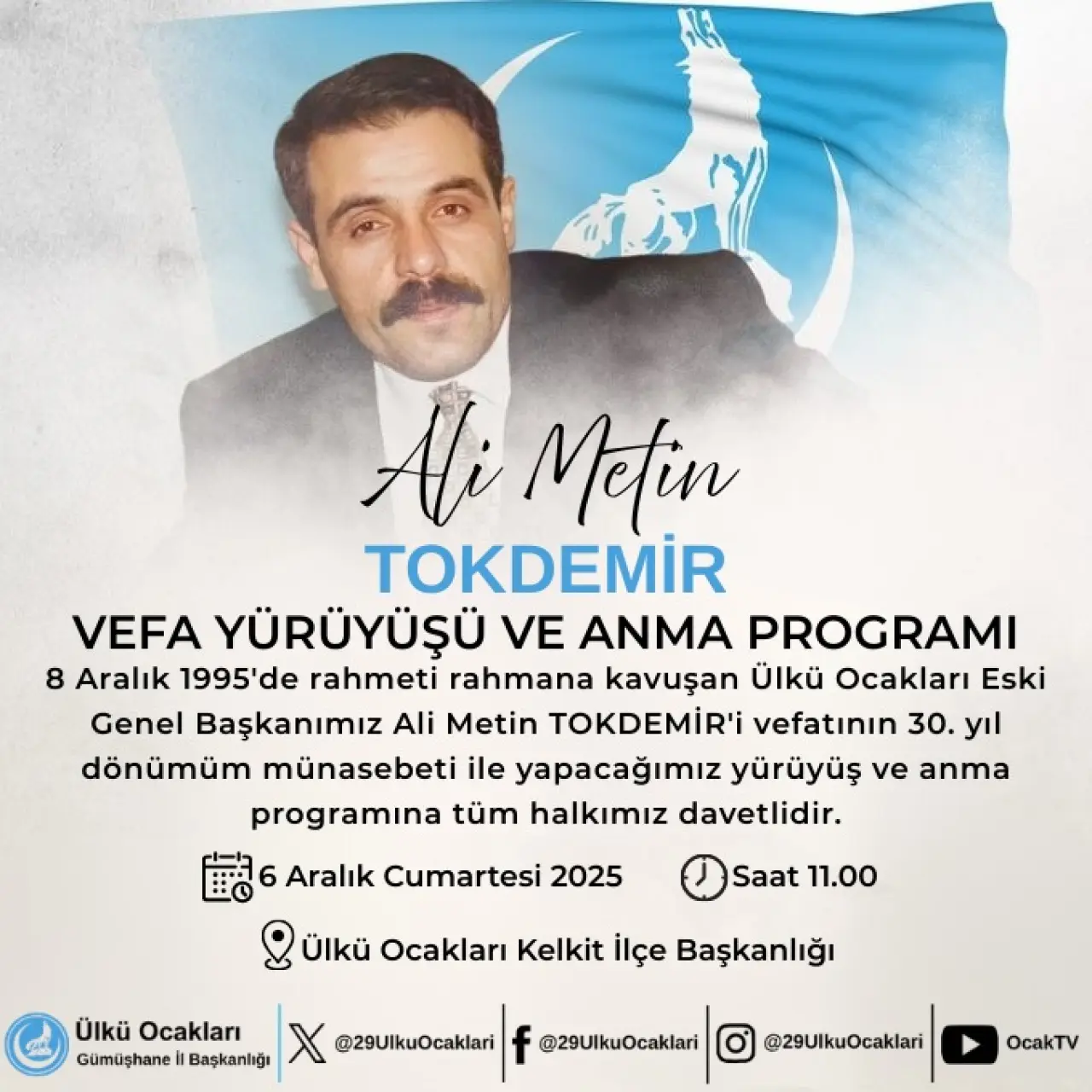 Gümüşhane Ülkü Ocakları Eğitim ve Kültür Vakfı tarafından organize edilen program kapsamında, "Dava Adamı" kimliğiyle tanınan Tokdemir için memleketi Kelkit’te geniş kapsamlı bir yürüyüş ve anma etkinliği düzenlenecek.