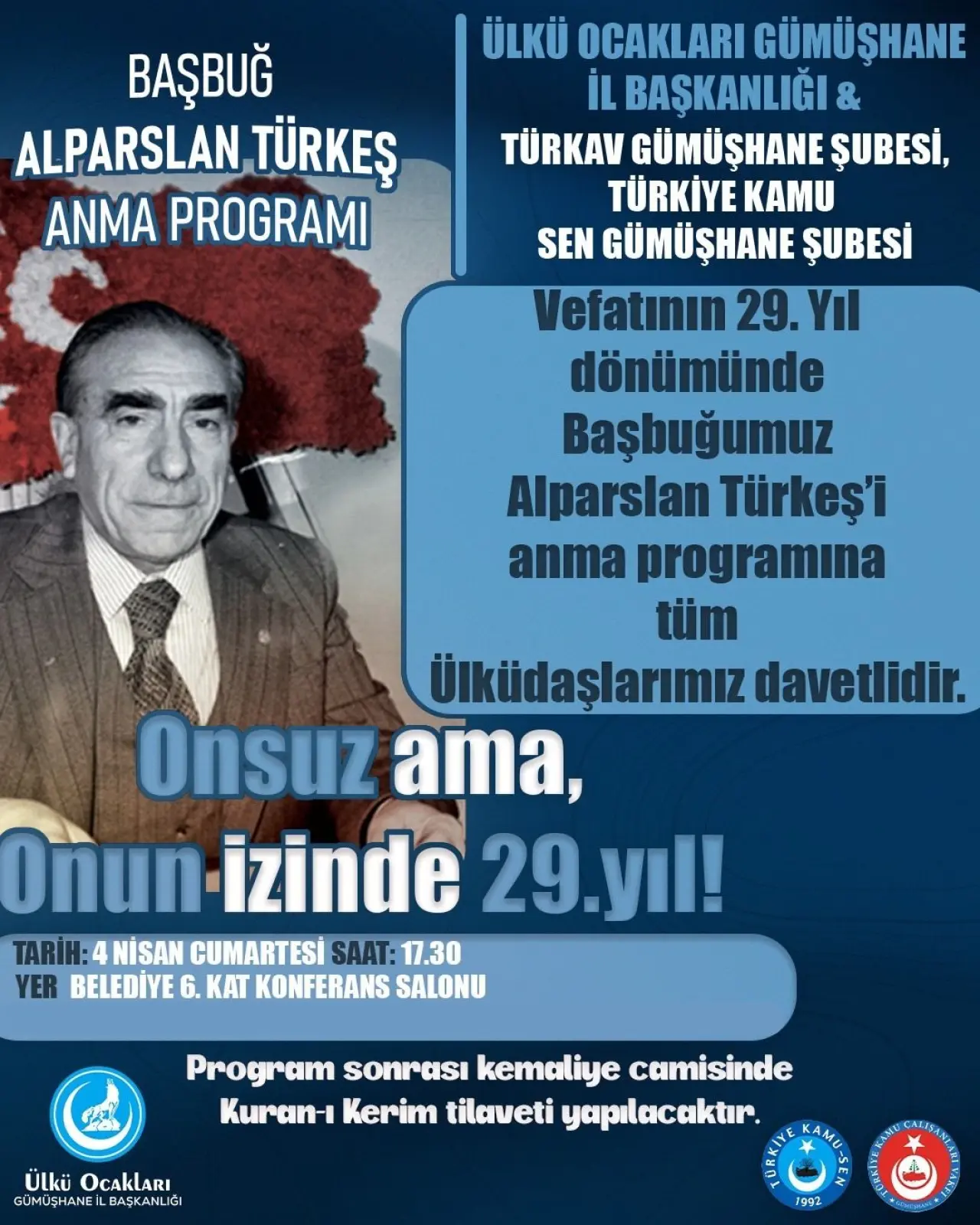 Ülkü Ocakları Gümüşhane İl Başkanlığı, Türk siyaset tarihine damga vuran liderlerden merhum Alparslan Türkeş’in vefatının 29. sene-i devriyesi dolayısıyla kapsamlı bir anma programı hazırladı.