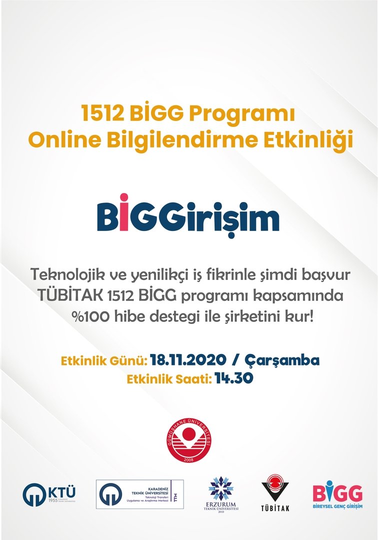 Gümüşhane Üniversitesinde 27 Temmuz 2020 tarihli ve 31198 sayılı Resmi Gazete’de yayımlanan yönetmelikle hizmet vermeye başlayan Gümüşhane Üniversitesi Teknoloji Transfer Ofisi Uygulama ve Araştırma Merkezi ile birlikte KTÜ TMM tarafından üniversitemiz akademisyenlerine ve lisansüstü öğrencilerine yönelik 1512 Bireysel Genç Girişim (BİGG) Programının tanıtımı kapsamında online bilgilendirme toplantısı yapılması planlandı.