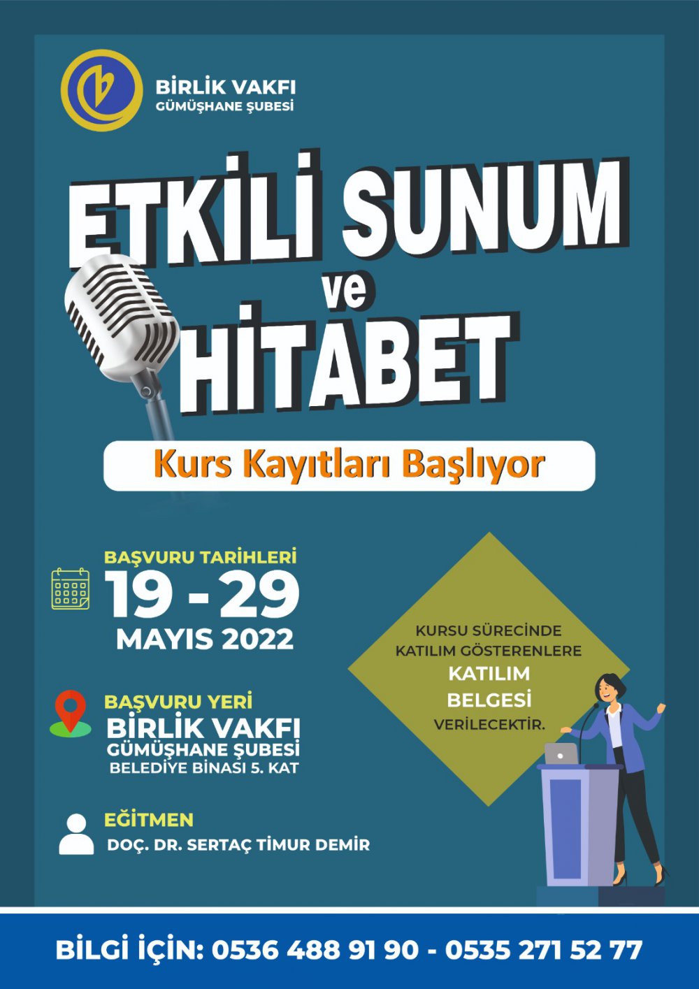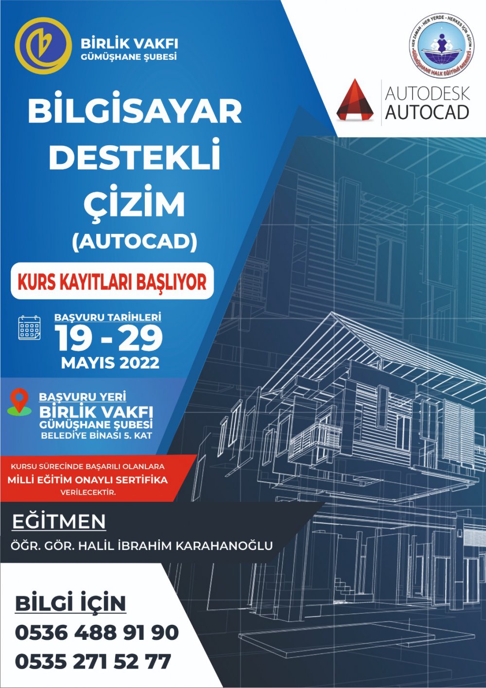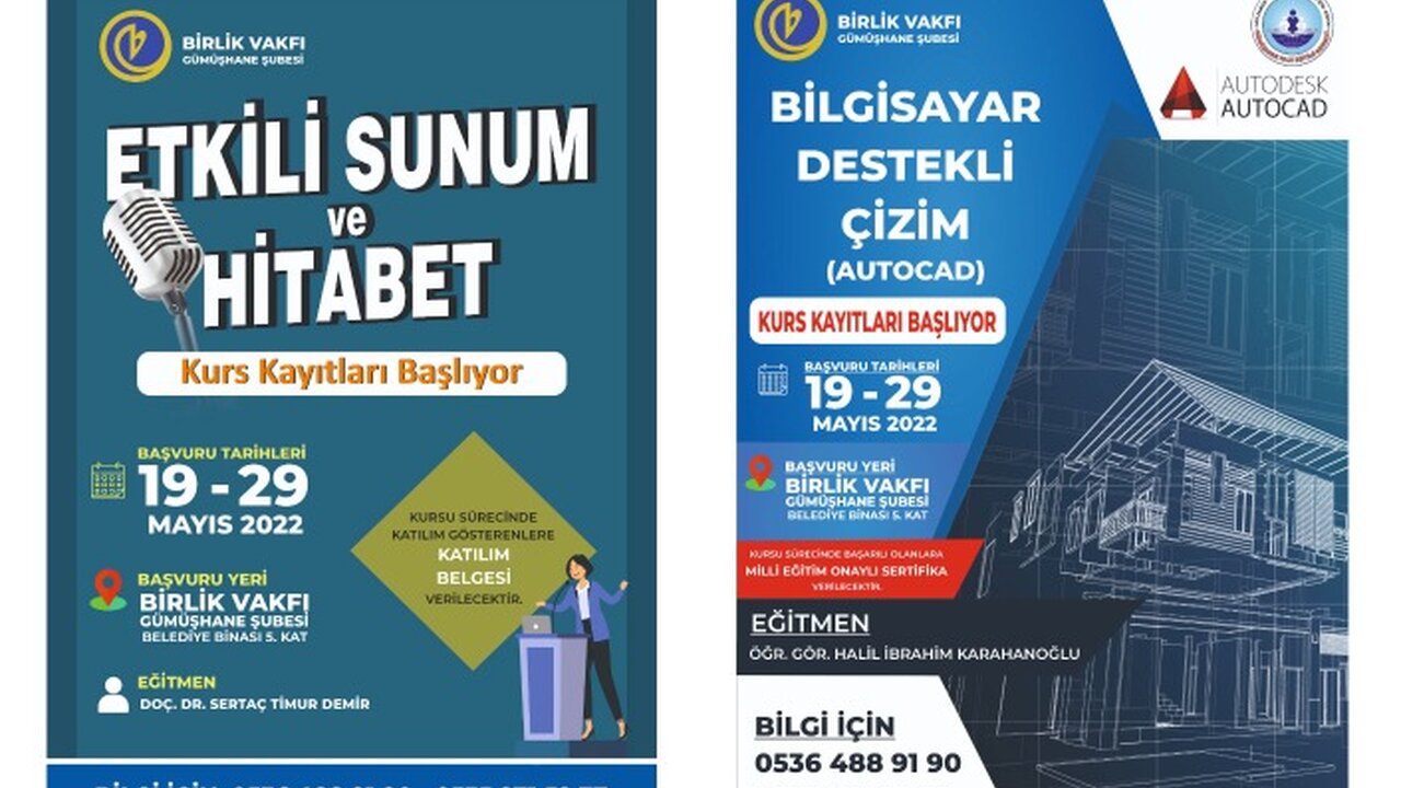 Birlik Vakfı Gümüşhane Şubesi, pandeminin ardından yüz yüze yapılacak iki ayrı kurs açıyor. Doç. Dr. Sertaç Timur Demir tarafından verilecek Etkili Sunum ve Hitabet ve Öğr. Gör. Halil İbrahim Karahanoğlu tarafından verilecek Bilgisayar Destekli Çizim (AutoCad) kurslarına kursiyerler ücretsiz olarak katılabilecek. Kursiyerlere eğitimlerin ardından katılım belgesi ve Milli Eğitim onaylı sertifika verilecek.