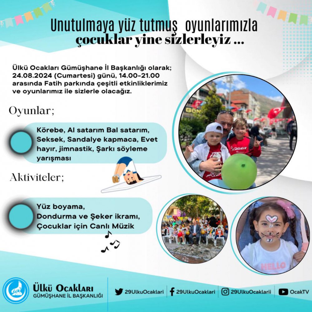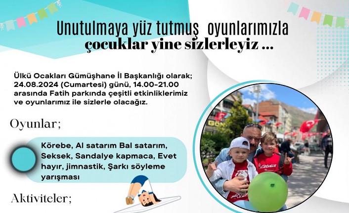 Yaz tatili boyunca çocuklara ve gençlere yönelik çok sayıda etkinlik düzenleyen Ülkü Ocakları İl Başkanlığı, şimdi de unutulmaya yüz tutmuş oyunların yer aldığı program düzenleyecek.
