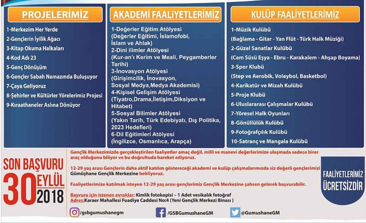 Kurumdan yapılan açıklamada, “Gençlik Merkezimizde gerçekleştirilen faaliyetler amaç değil, milli ve manevi değerlerimize ulaşmada sadece birer araç olduğunu biliyor ve bu doğrultuda hareket ediyoruz.  12-29 yaş arası Gençlerin daha aktif katılım göstereceği akademi ve kulüp çalışmalarımızda siz değerli gençlerimizi Gümüşhane Gençlik Merkezine bekliyoruz” dendi.