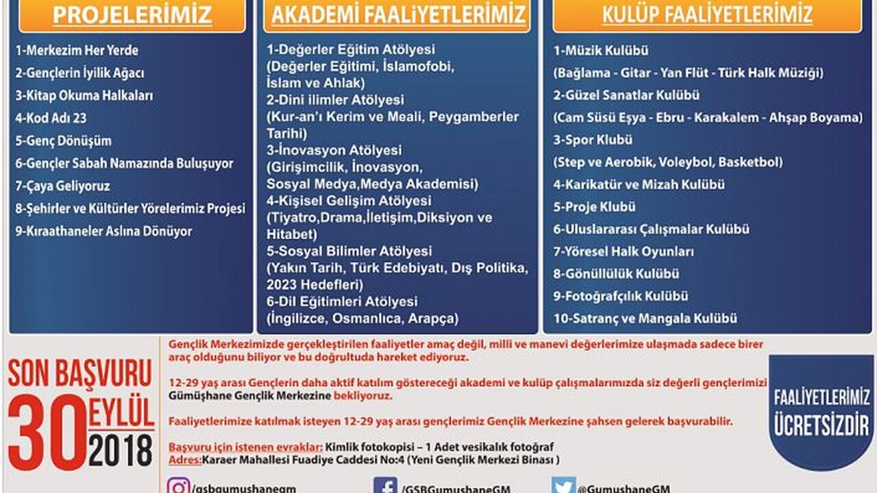 Gümüşhane Haberleri Duyuru Gençlik Merkezi akademi ve kulüp faaliyetleri başlıyor