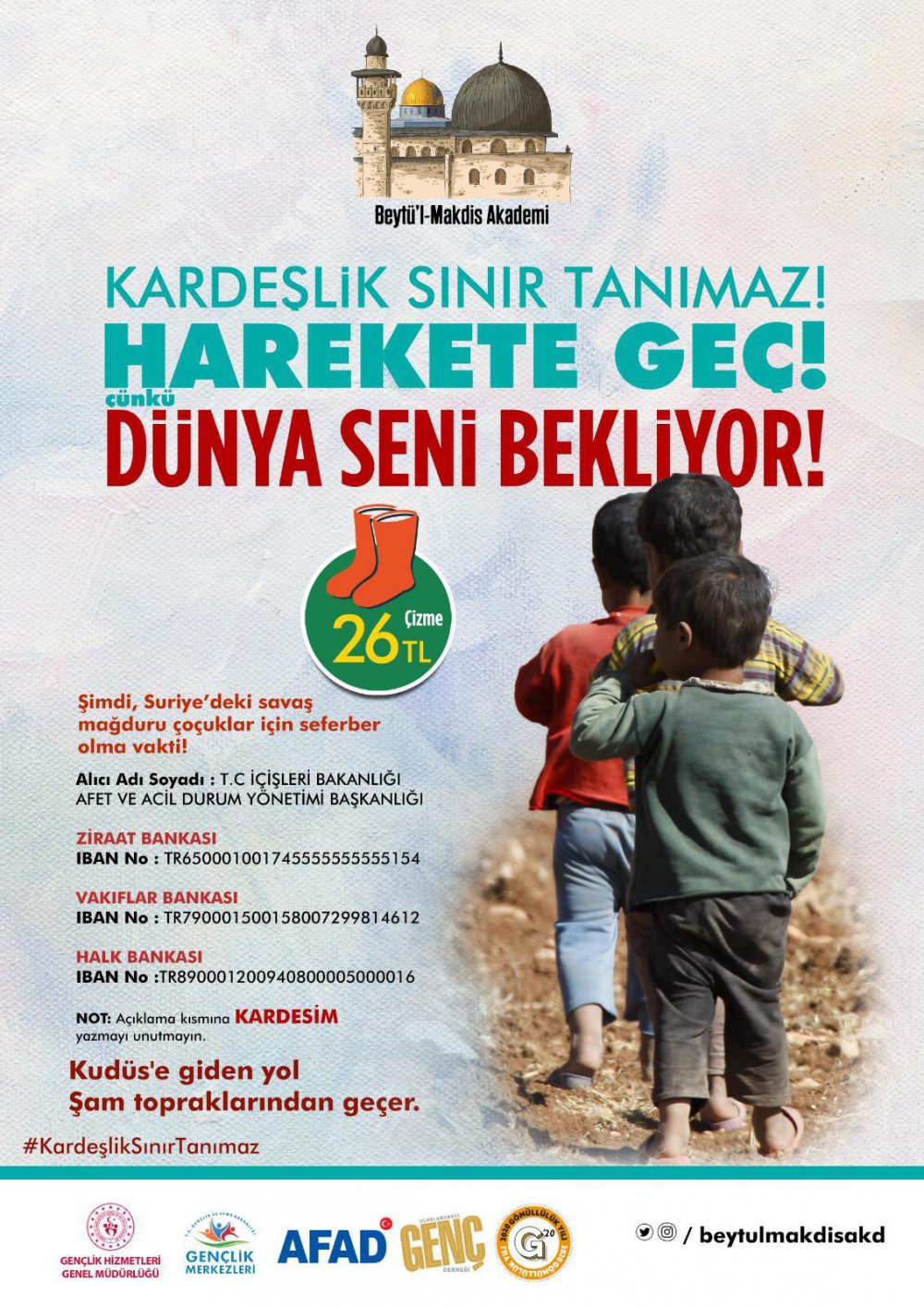 Kurumdan yapılan açıklamada sınırımızın az ötesinde mülteci kamplarında binlerce masum kardeşimizin küçücük yürekleriyle soğuk kış aylarında ayaklarına giyecek hiçbir şeyleri olmadan nefes almasından hareketle gönül erleri olarak gönülden gönüle iyilik yolunda buna kayıtsız kalmayarak gençlik merkezleri bünyesinde bir kampanya başlattıkları kaydedildi.