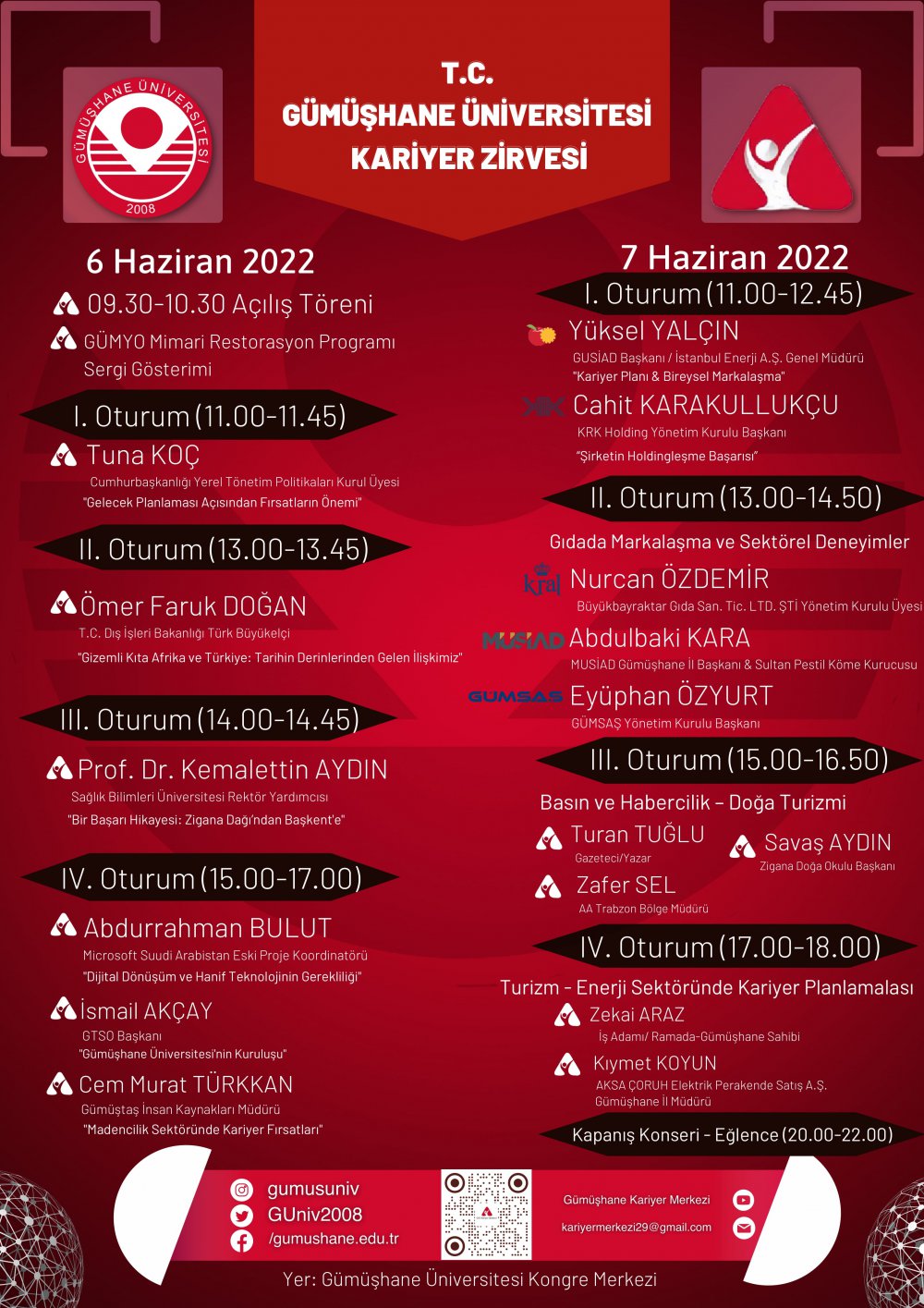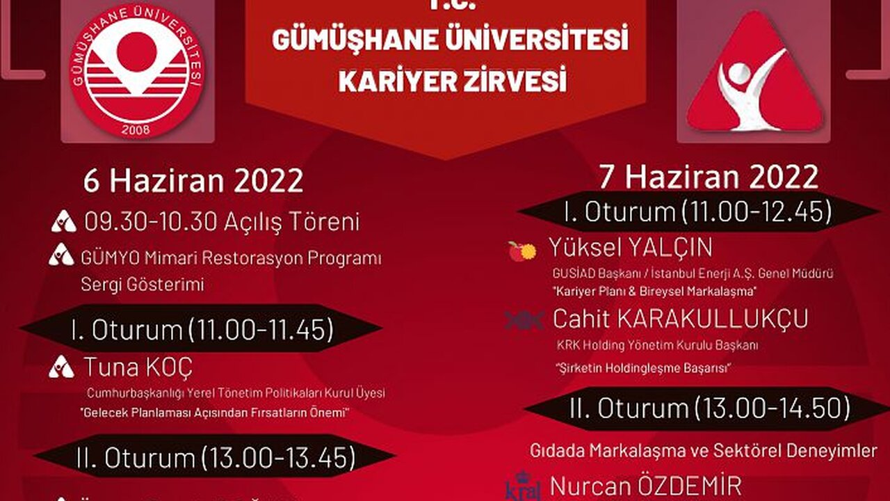 Üniversitenin Kongre ve Kültür Merkezi’nde gerçekleştirilecek Kariyer Zirvesi’nin ilk gününde “Gelecek Planlaması Açısından Fırsatların Önemi, Gizemli Kıta Afrika ve Türkiye: Tarihin Derinlerinden Gelen İlişkimiz, Bir Başarı Hikayesi: Zigana Dağı’ndan Başkent’e, Dijital Dönüşüm ve Hanif Teknolojinin Gerekliliği, Gümüşhane Üniversitesi’nin Kuruluşu, Madencilik Sektöründe Kariyer Fırsatları” başlıklarında sunumlar yapılacak. Kariyer Zirvesi’nin ikinci gününde ise “Kariyer Planı & Bireysel Markalaşma, Gıdada Markalaşma ve Sektörel Deneyimler ile Basın ve Habercilik-Doğa Turizmi” başlıklarında sunumlar gerçekleştirilecek.