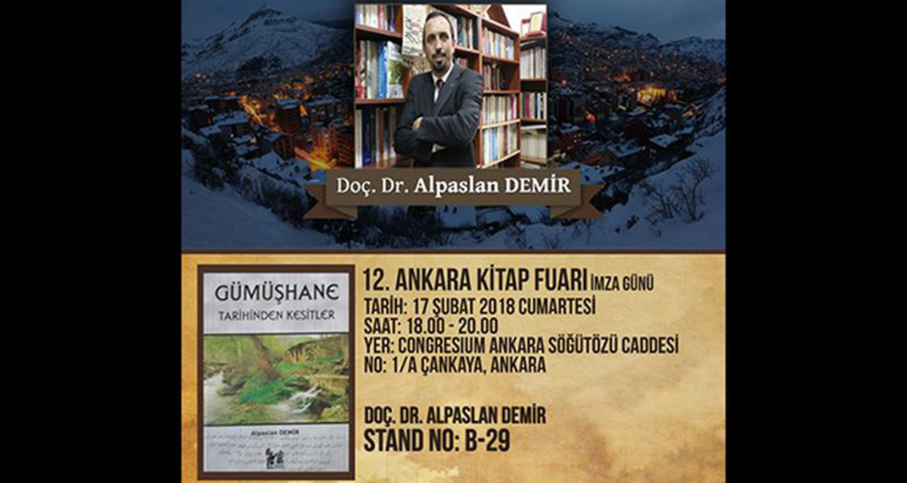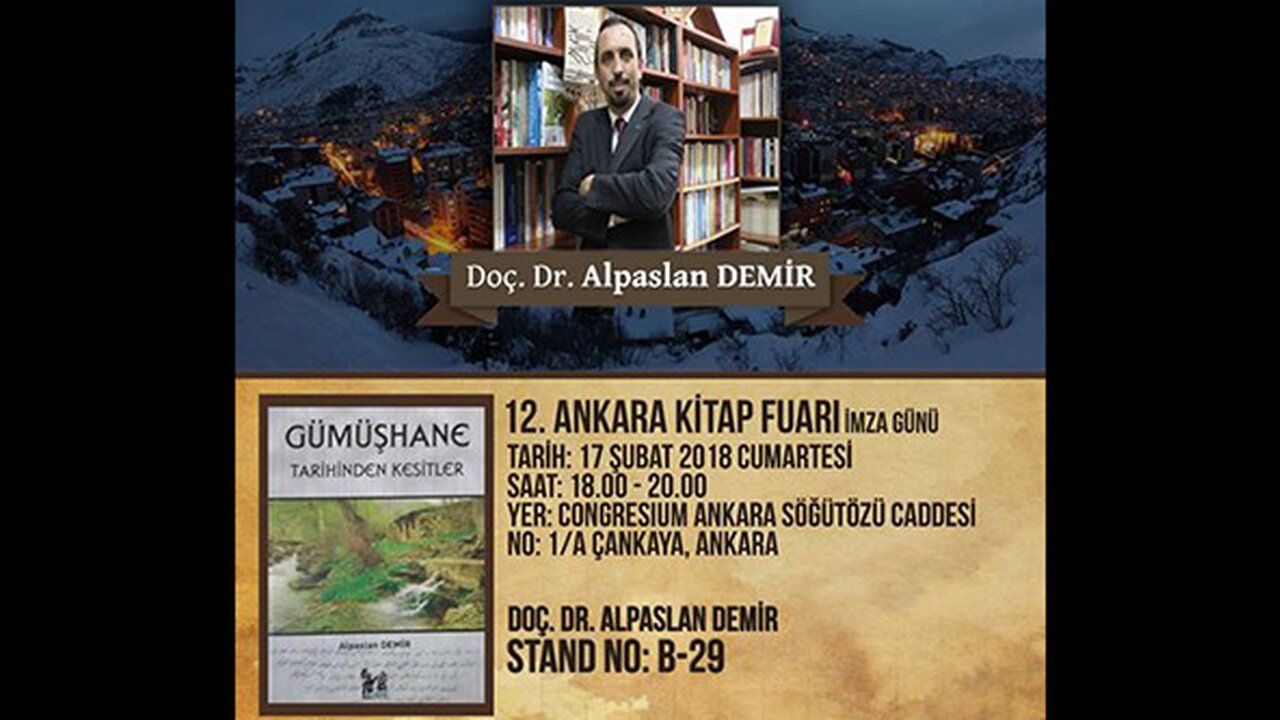 Gümüşhaneli akademisyen Doç.Dr. Alpaslan Demir tarafından kaleme alınan 'Gümüşhane tarihinden kesitler' kitabı için 12.Ankara Kitap Fuarında imza günü düzenlenecek.