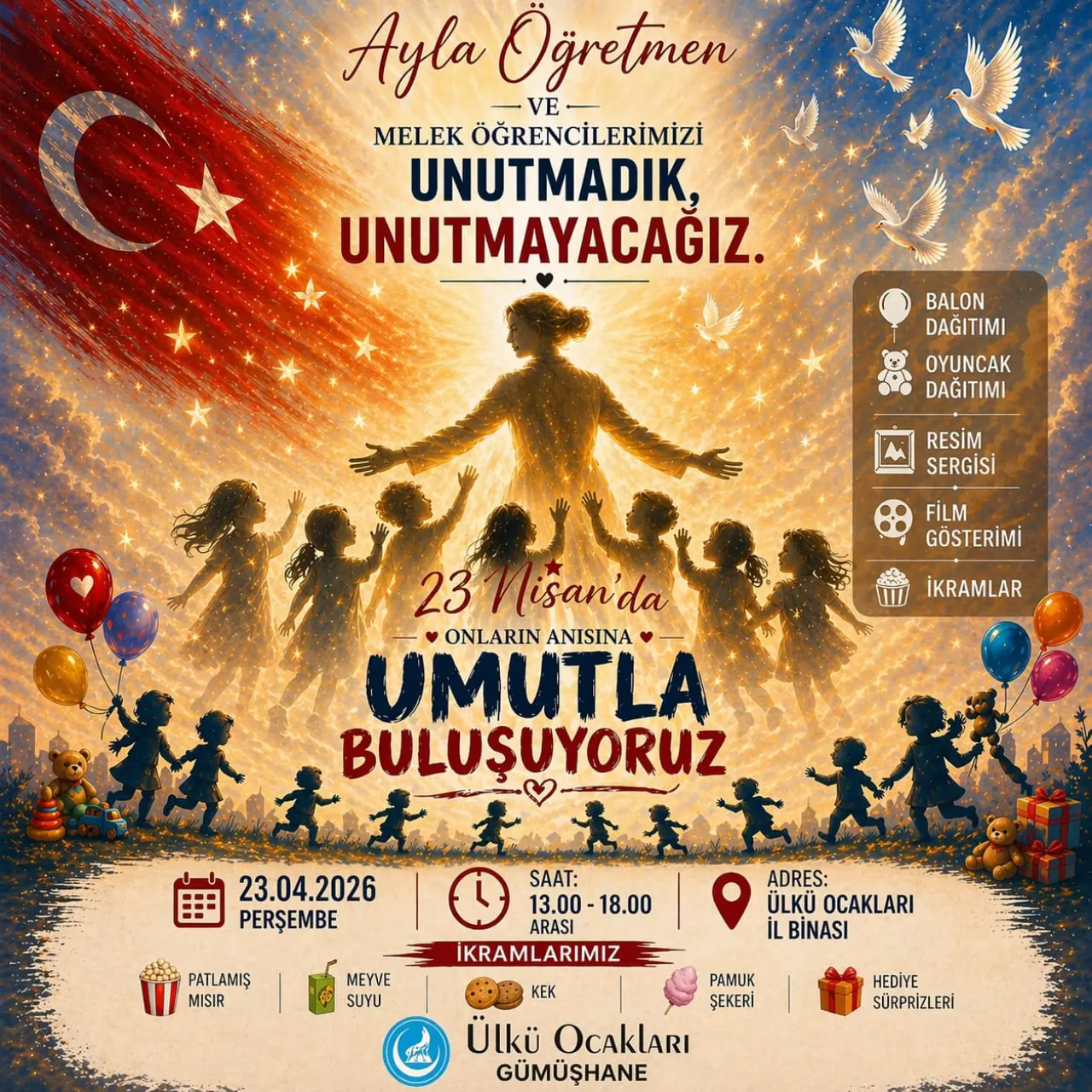Ülkü Ocakları Gümüşhane İl Başkanlığı tarafından yapılan açıklamada, “23 Nisan’da sadece bir bayramı değil, aynı zamanda geleceğimizin teminatı olan çocuklarımızı ve ebediyete irtihal eden evlatlarımızı da anıyoruz. Bu anlamlı günde tüm çocuklarımızı ve kıymetli ailelerini programımıza davet ediyoruz” ifadelerine yer verildi.