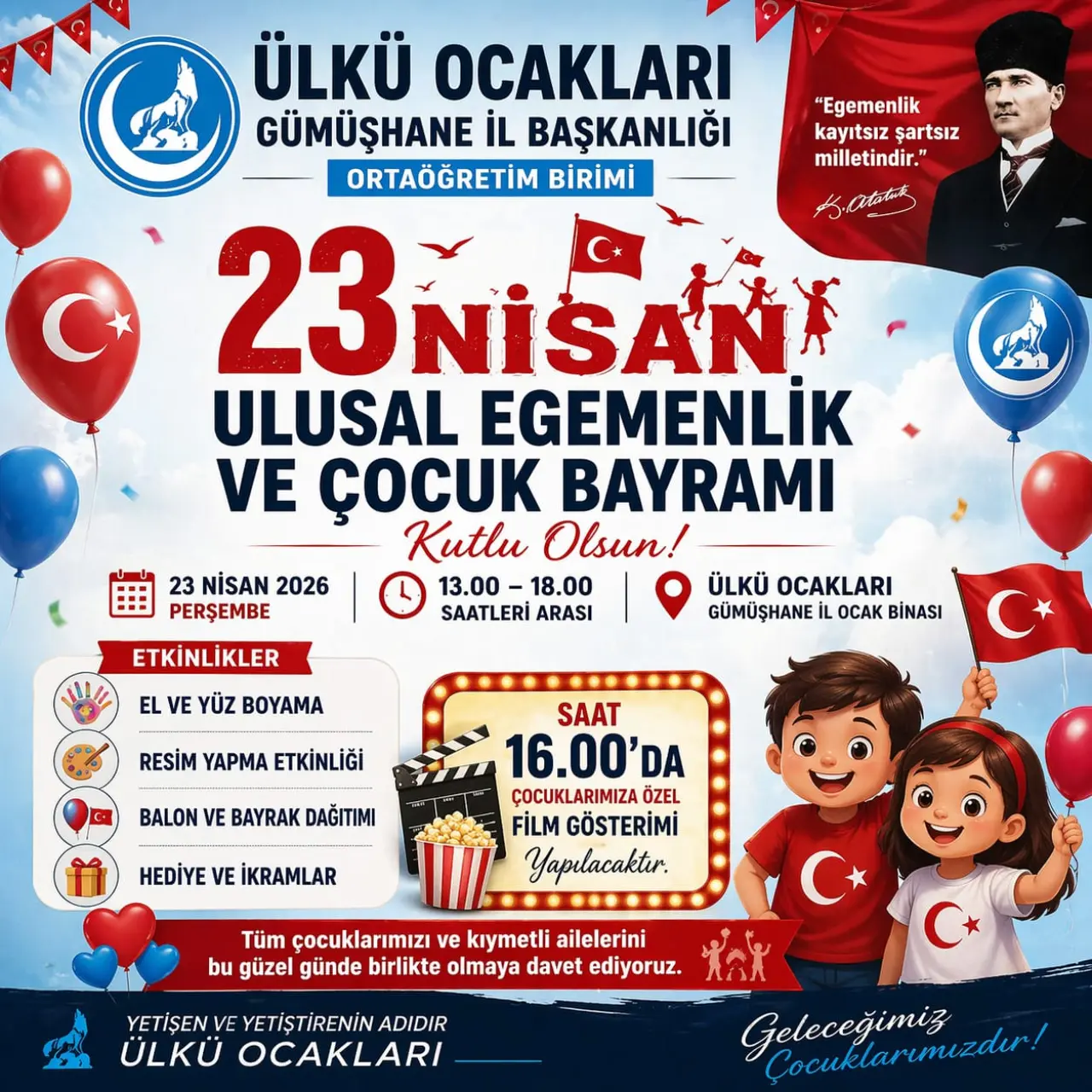 23 Nisan 2026 Perşembe günü saat 13.00 ile 18.00 arasında Ülkü Ocakları Gümüşhane İl Binası’nda gerçekleştirilecek etkinlikte; balon ve oyuncak dağıtımı, resim sergisi, film gösterimi ve çeşitli ikramlar yer alacak.