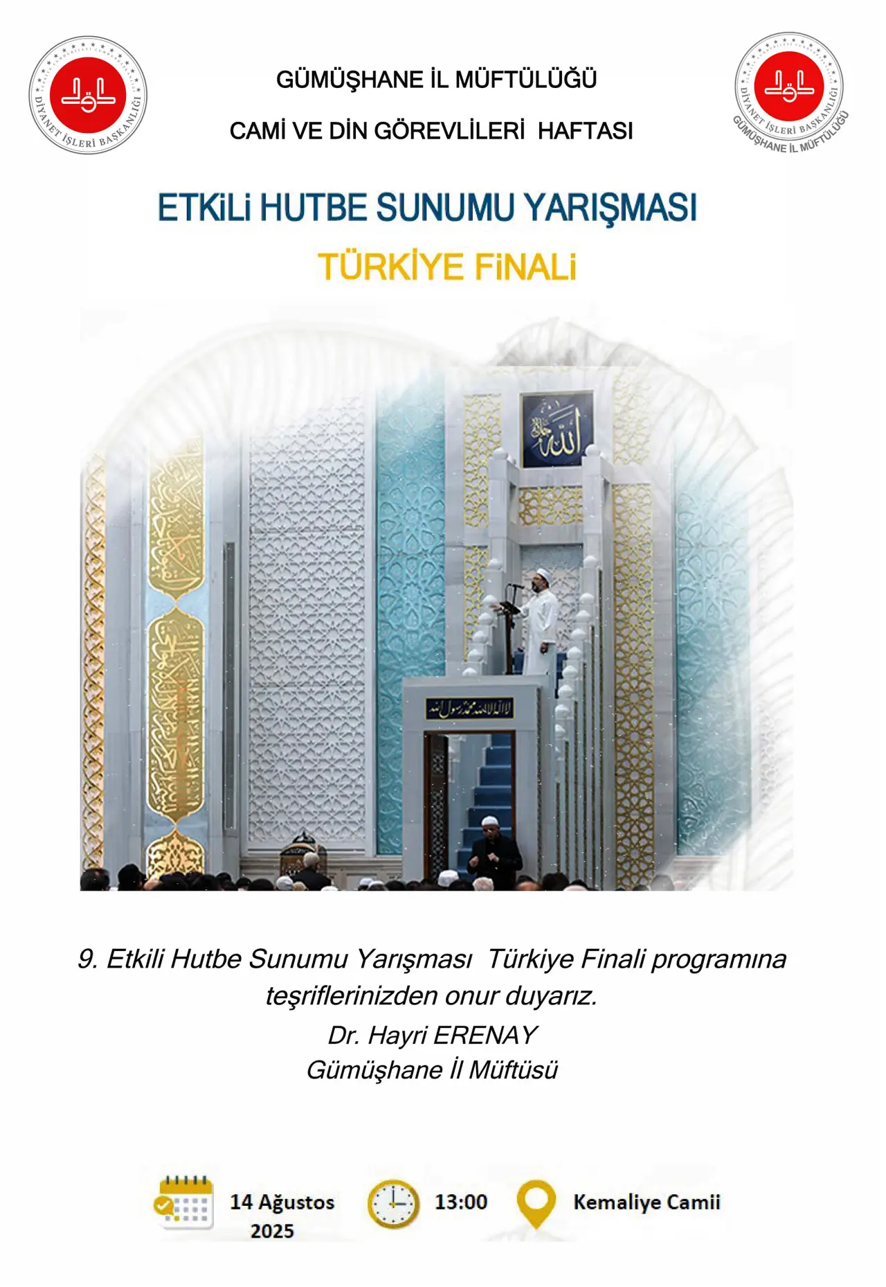 Diyanet İşleri Başkanlığı ve Gümüşhane İl Müftülüğü'nün ortaklaşa düzenlediği "9. Etkili Hutbe Sunumu Yarışması Türkiye Finali" Kemaliye Camii'nde gerçekleştirilecek.