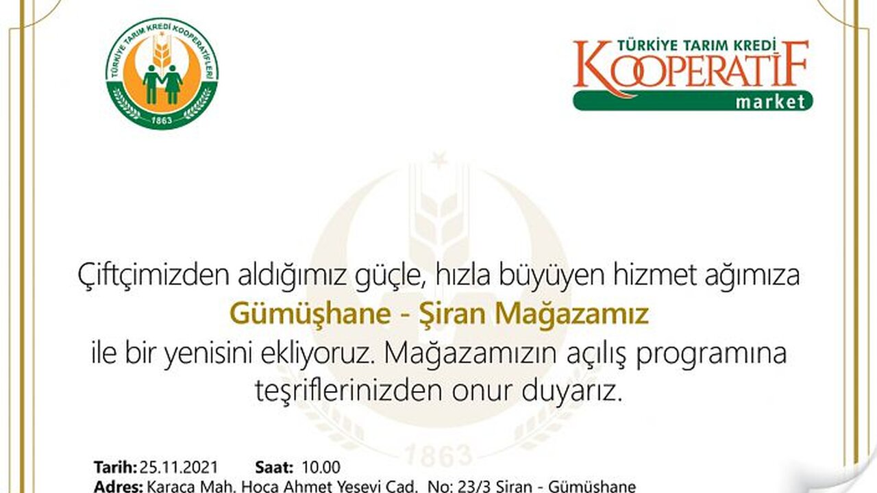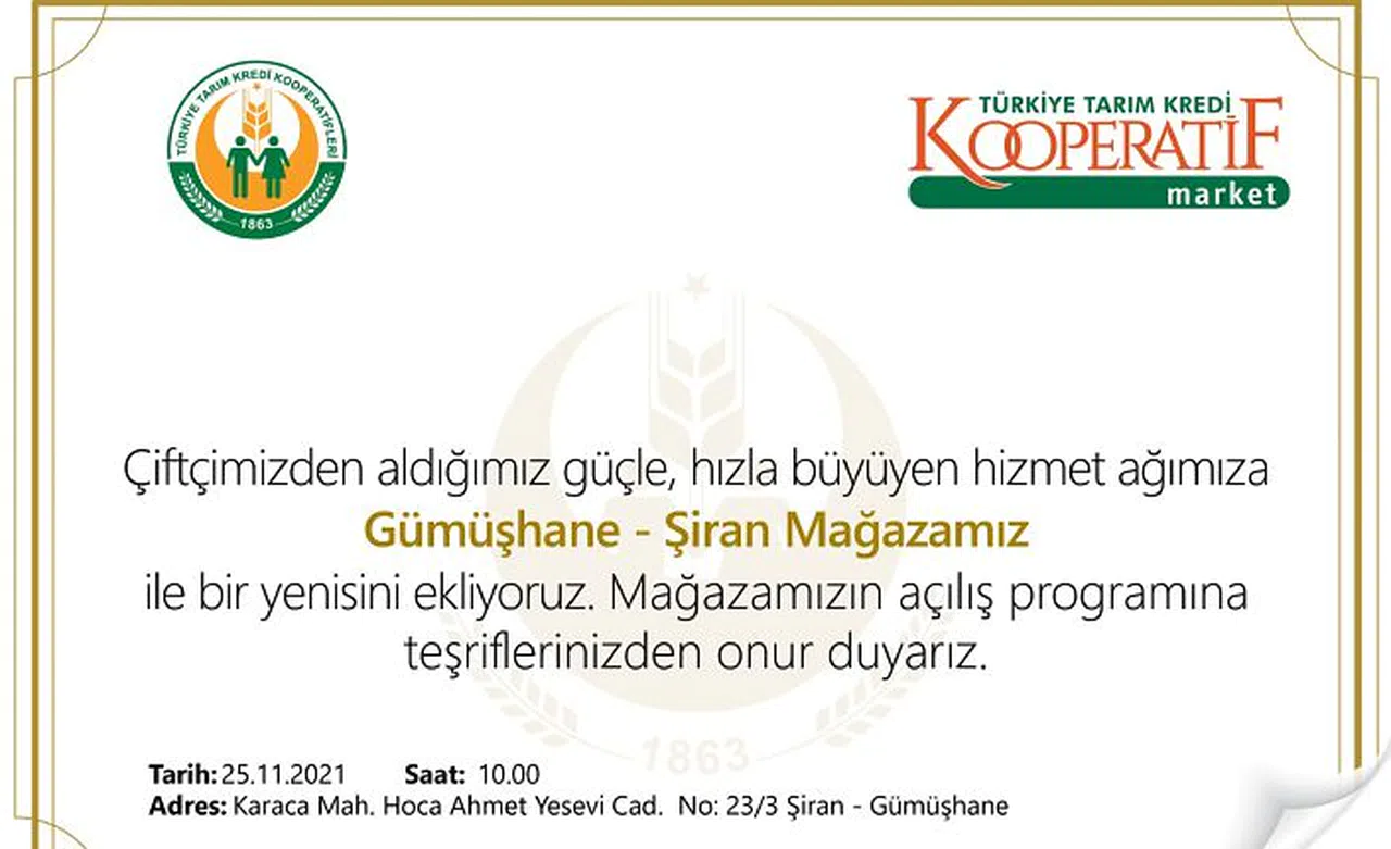 Türkiye Tarım Kredi Kooperatiflerinin Türkiye genelinde şubeleşme yönünde attığı adımları sonrası Gümüşhane’de ilk mağazası Şiran ilçesinde açılıyor.