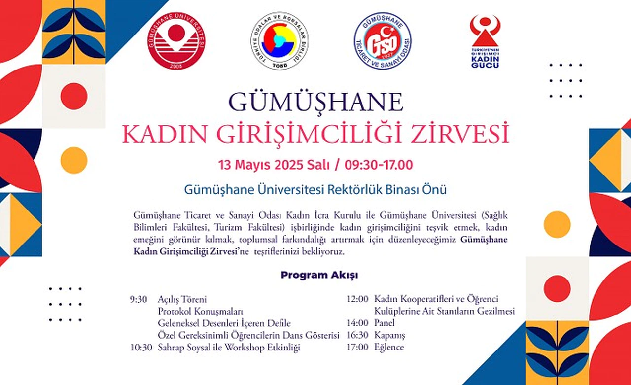 13 Mayıs 2025 Salı günü 09.30 ile 17.00 arasında Gümüşhane Üniversitesi TÖMER Konferans Salonu ve Rektörlük Binası Önünde gerçekleştirilecek çeşitli etkinliklerle gerçekleştirilecek olan ‘Gümüşhane Kadın Girişimcilik Zirvesi’nde  Geleneksel Desenleri İçeren Defile, Özel gereksinimli öğrencilerin dans gösterisi, Türk Yemek Uzmanı ve Yazar Sahrap Soysal ile Workshop etkinliği, Kadın Kooperatifleri ve öğrenci kulüplerine ait çeşitli stantlar,  TOBB Kadın Girişimciler Üst Kurulu Üyeleri Elif Ülger Yalçın, Zuhal Akyüzlü, Fatma Aydoğdu ve Gümüşhane’nin değerli girişimci kadınlarından Nurcan Özdemir’in katkıları ile  tecrübe paylaşımı kadın girişimcilik konulu bir panel ve çeşitli etkinlikler gerçekleştirilecek.