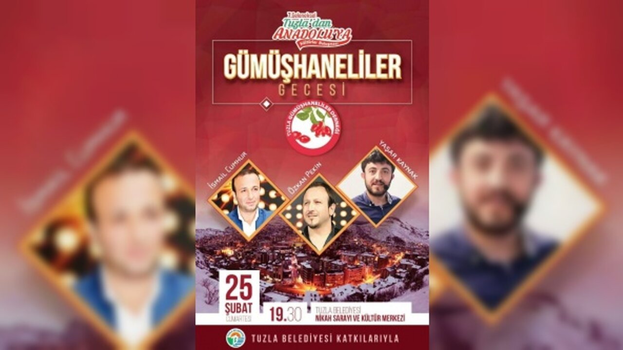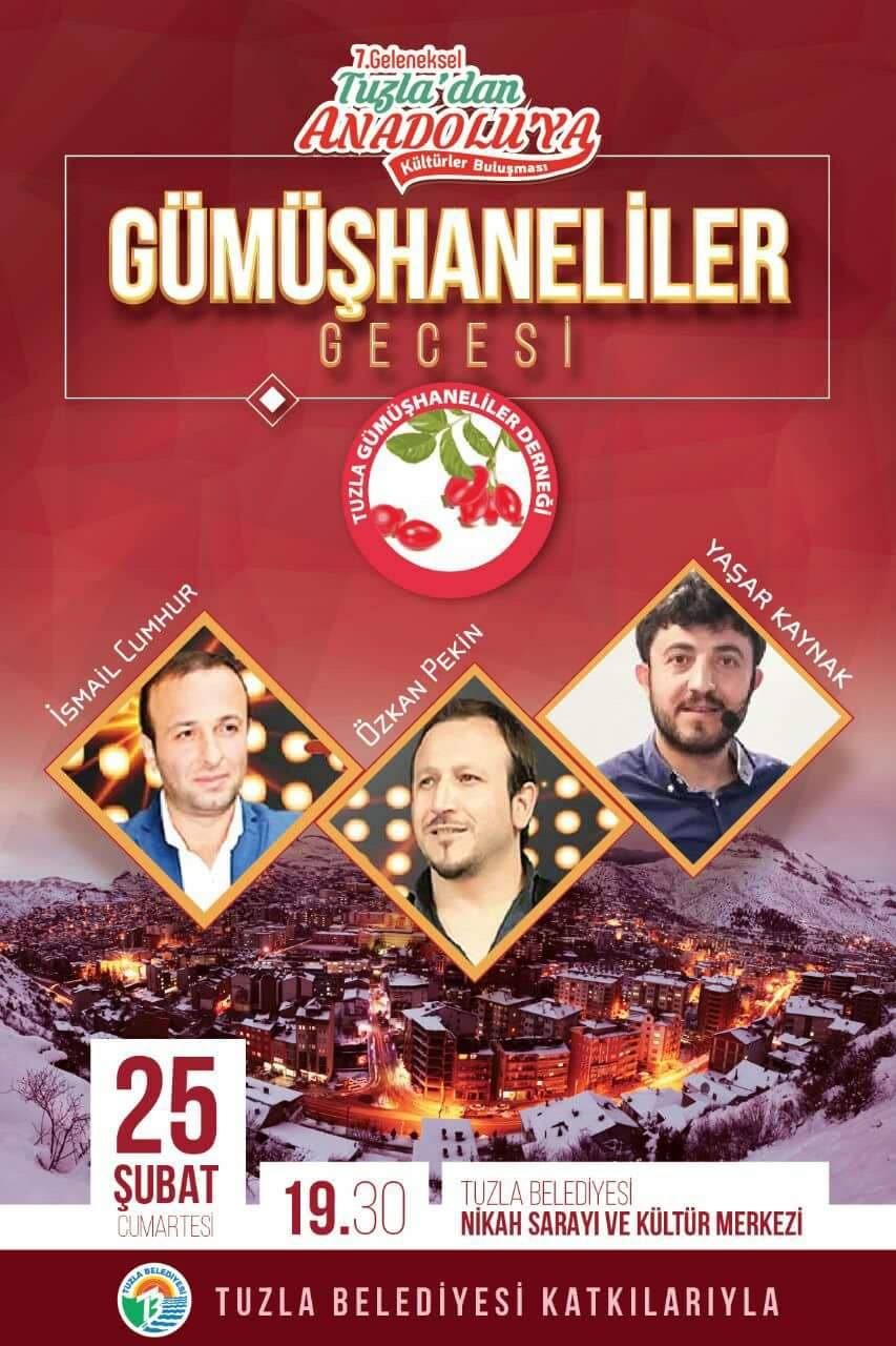 25 Şubat tarihinde Tuzla Belediyesi Nikah ve Kültür Sarayında Tuzla Gümüşhaneliler Derneğinin düzenleyeceği programa sanatçılar Yaşar Kaynak, İsmail Cumhur ve Özkan Pekin katılacak.