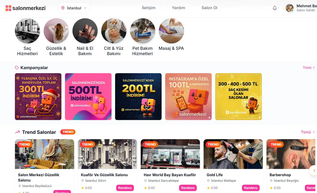 Türkiye’nin lider ve tek gerçek pazar yeri uygulaması olma vizyonuyla hareket eden platform, her geçen gün genişleyen üye ağıyla sektörün lokomotifi konumunda. İster küçük bir mahalle kuaförü olun, ister büyük bir güzellik merkezi zinciri; salon merkezi çatısı altında yer almak, işletmenizin profesyonelliğini tescillemek demektir.