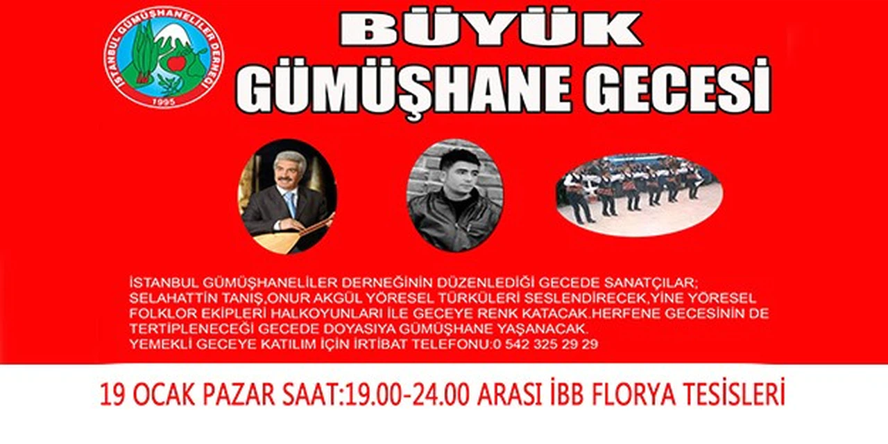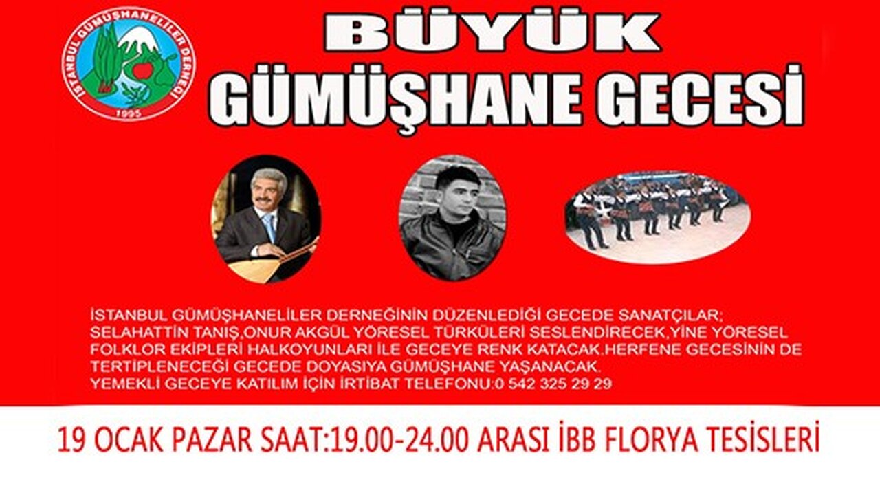 İstanbul Gümüşhaneliler Derneği tarafından düzenlenen "Büyük Gümüşhane" gecesi 19 Ocak pazar günü yapılacak.
