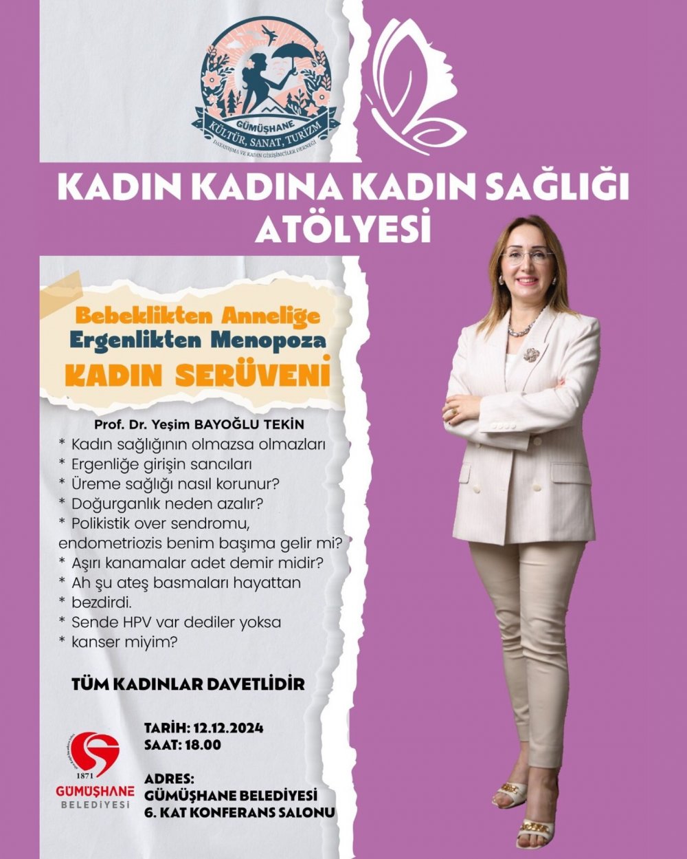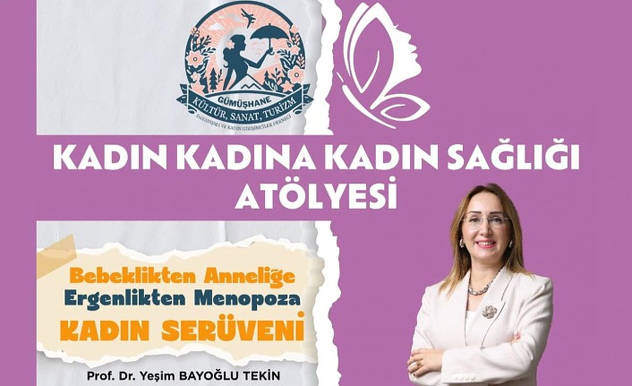 Gümüşhane Kültür, Sanat, Turizm Dayanışma ve Kadın Girişimcilik Derneği, Prof.Dr. Yeşim Bayoğlu Tekin’in konuşmacı olarak katılacağı “Kadın kadına, Kadın Sağlığı Atölyesi” programı düzenleyecek.