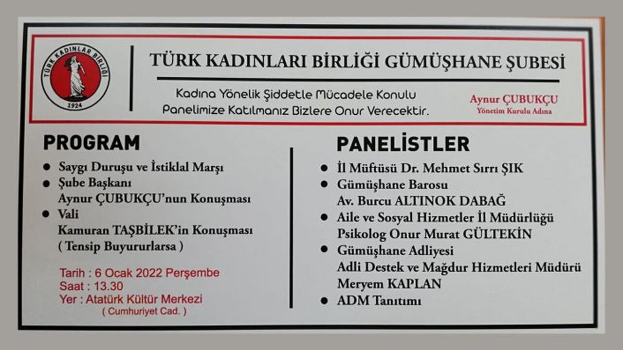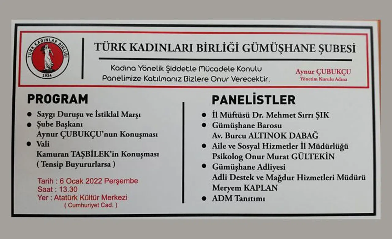 Panele katılımın ücretsiz olduğunu belirterek tüm vatandaşları davet eden Türk Kadınlar Birliği Gümüşhane Şube Başkanı Aynur Çubukçu, programda ayrıca ADM tanıtımı yapılacağını da sözlerine ekledi.