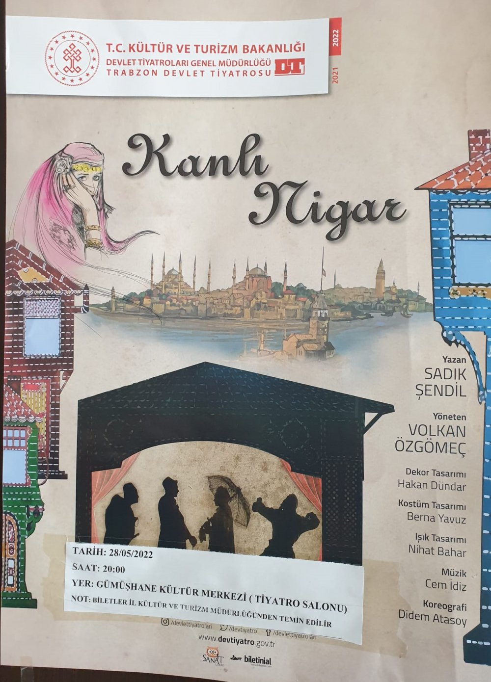 Sadık Şendil'in yazdığı Volkan Özgömeç'in yönettiği Kanlı Nigar adlı oyunun yönetmen yardımcısı koltuğunda Trabzon Devlet Tiyatrosu sanatçılarından N. Mert Hürol ve Fatma Kum Ertekin oturuyor.