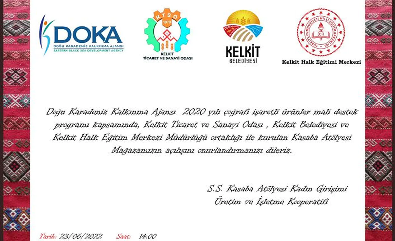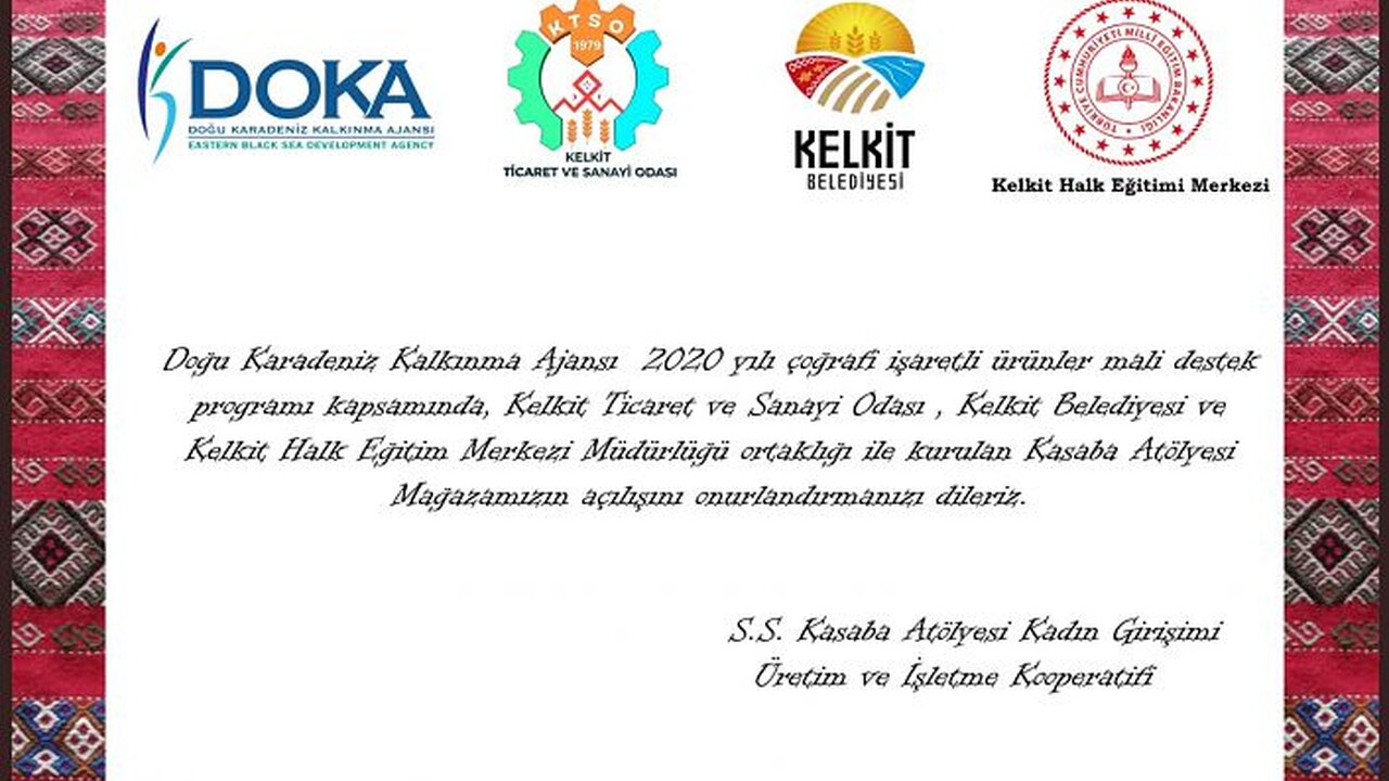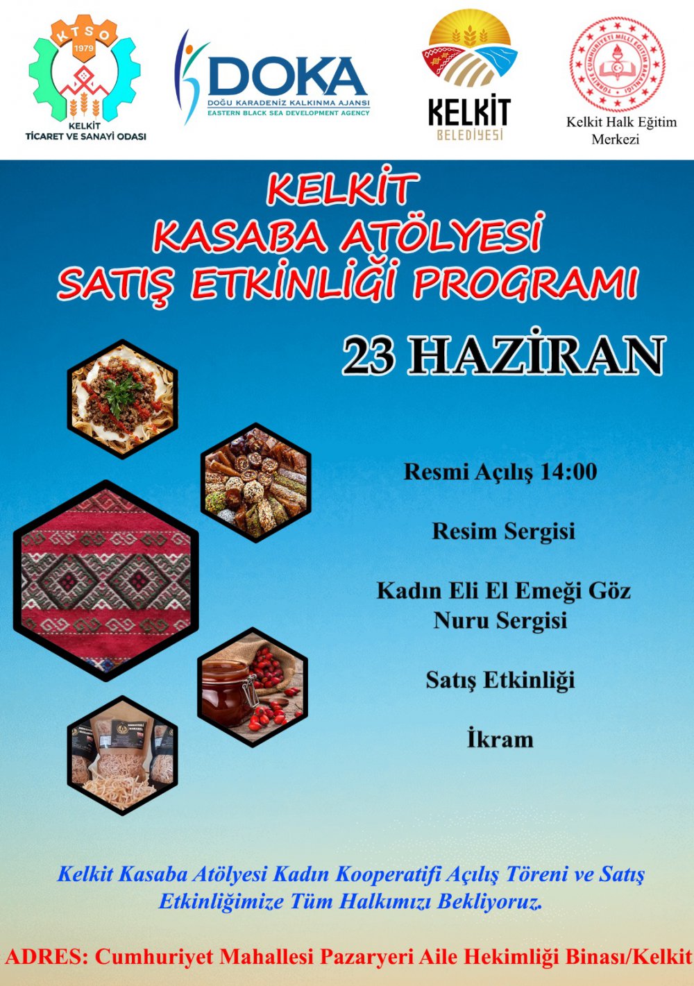 Gümüşhane’nin Kelkit ilçesinde Kelkit Ticaret ve Sanayi Odası, Kelkit Belediyesi ve Kelkit Halk Eğitimi Merkezi Müdürlüğü ortaklığı ile kurulan, DOKA tarafından desteklenen ve yalnızca kadınların ürünlerinin yer aldığı “Kasaba Atölyesi” mağazası açılıyor.