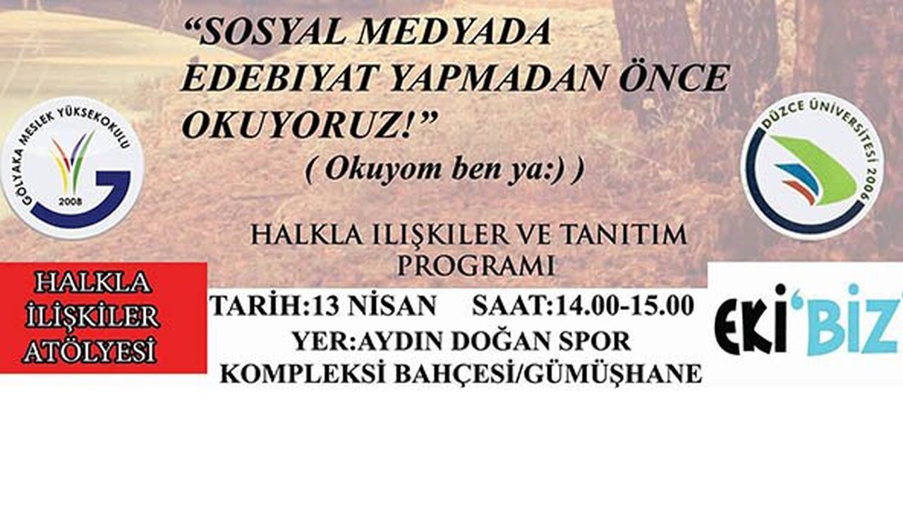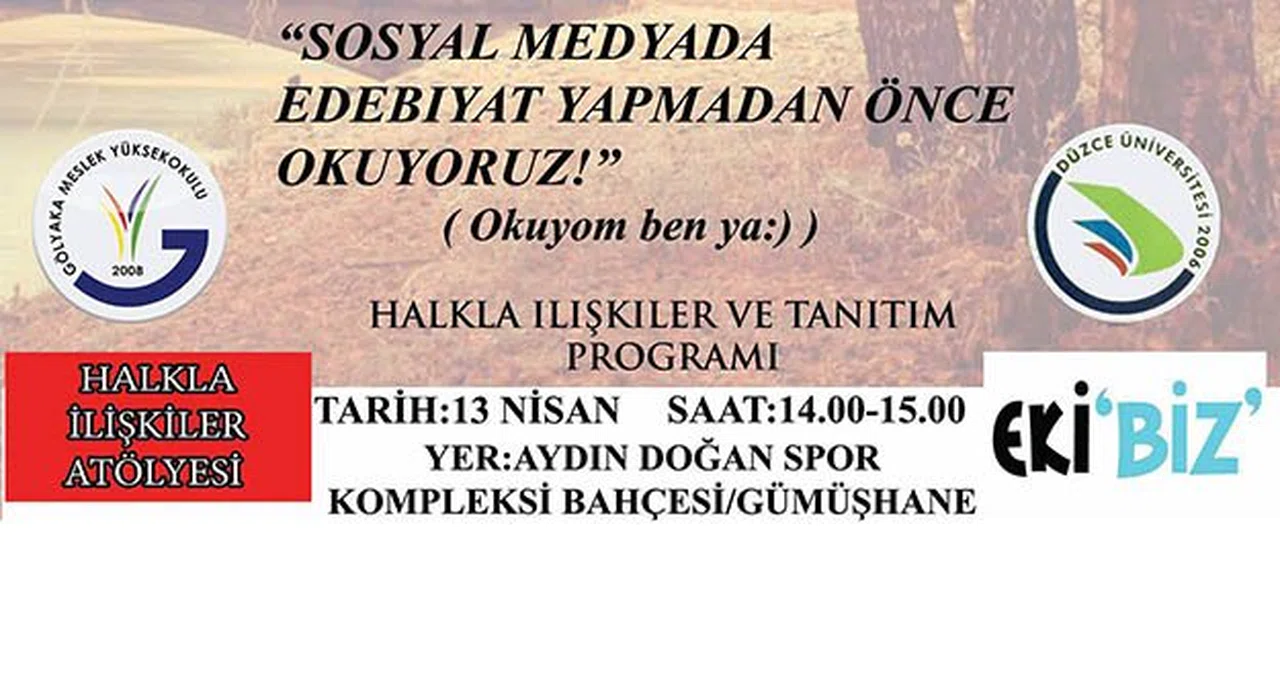 Gümüşhane’de Düzce Üniversitesi Gölyaka Meslek Yüksekokulu Halkla İlişkiler ve Tanıtım Programı, Eki'Biz ve Gümüşhane Gençlik Merkezinin katkılarıyla 40 il ve 3 ülkede aynı anda ‘Kitabını al gel’ projesi gerçekleştirilecek.