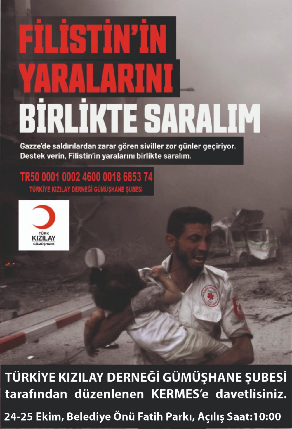 Türk Kızılay'ı Gümüşhane Şubesinin Filistin'in yaralarını birlikte saralım sloganıyla başlattığı yardım kampanyası da devam ediyor. Nakdi yardımda bulunmak isteyenler TR50 0001 0002 4600 0018 6853 74 iban numarasına ödeme yapabiliyor.