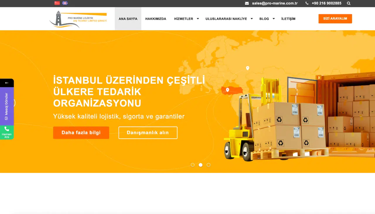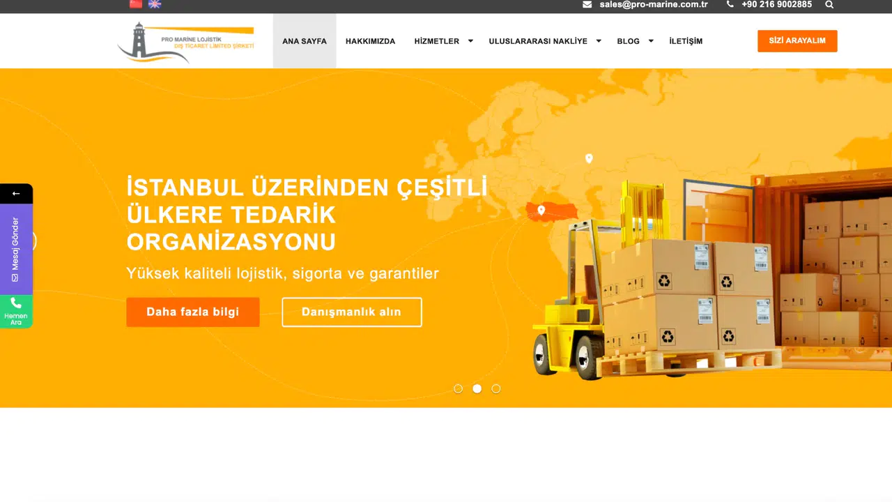 Türkiye’nin önde gelen lojistik firmalarından biri olan Pro Marine Lojistik, uluslararası nakliye ve taşımacılık sektöründe uzmanlaşmış, güvenilir ve yenilikçi çözümler sunan bir markadır. Denizyolu, karayolu ve havayolu taşımacılığında geniş bir hizmet yelpazesine sahip olan firma, dünya çapındaki geniş acente ağıyla müşterilerine hızlı, güvenli ve rekabetçi fiyatlı lojistik çözümleri sunar.