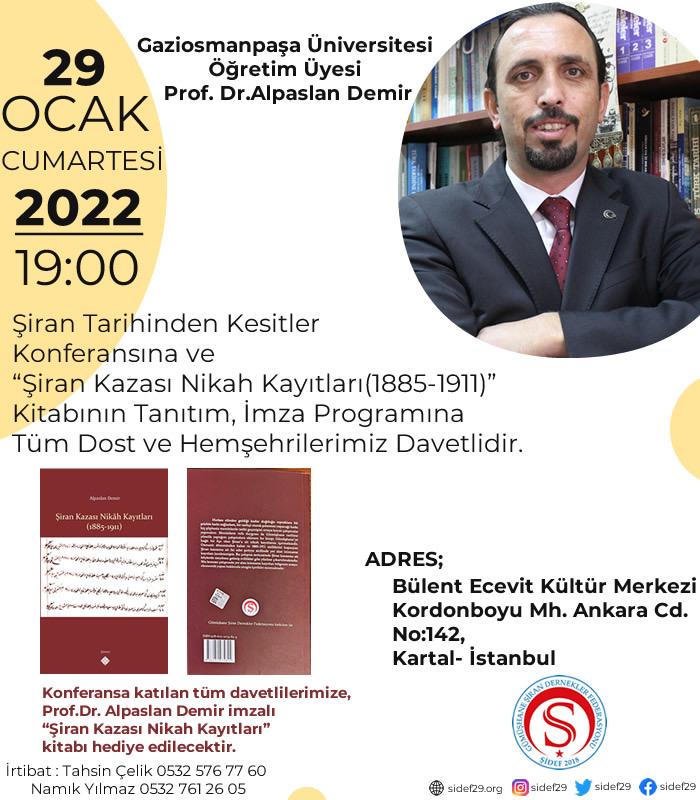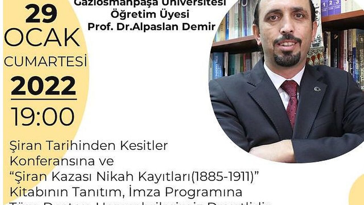 Prof. Dr. Alpaslan Demir’in anlatımıyla “Şiran Tarihinden Kesitler konferansı ve “Şiran Kazası Nikah Kayıtları (1885-1911)” kitap tanıtım ve imza programı 29 Ocak Cumartesi saat 19.00’da Kartal İBB Bülent Ecevit Kültür Merkezinde gerçekleşecek.